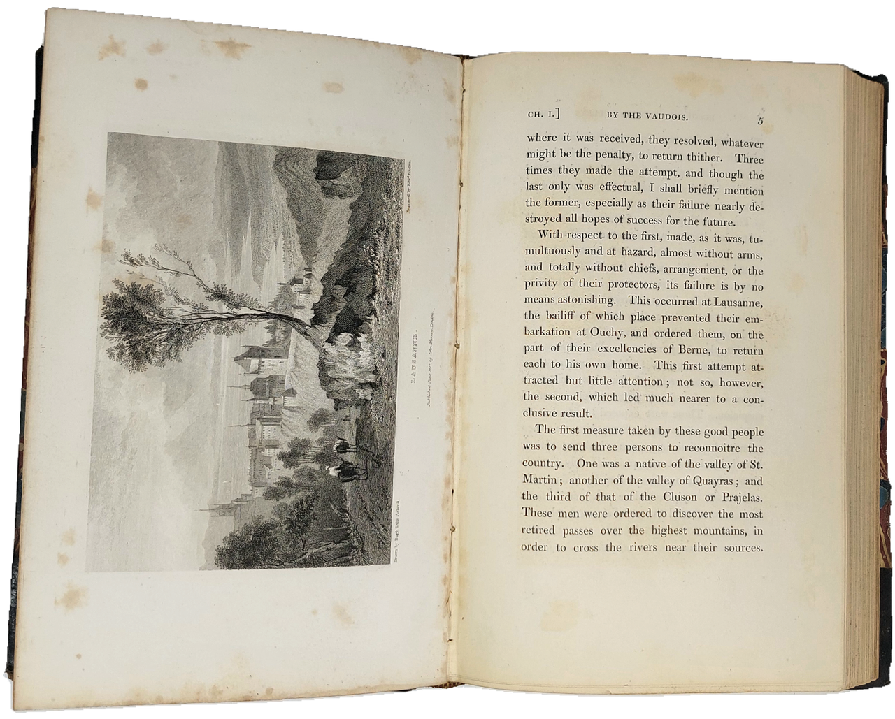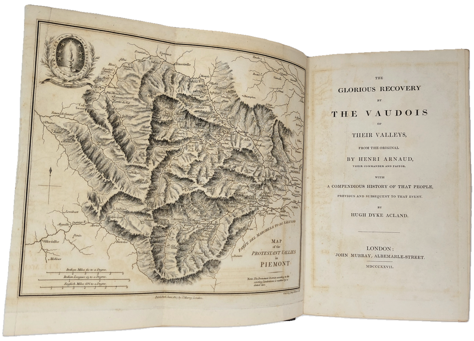 >in-8, pp. XX, 240, leg. coeva m. pelle e ang., tit. e fregi oro al dorso. Con 12 tavole f.t. di vedute inc. in acciaio (Losanna, Lucerna, Susa, Prali, Mont Cenis, Salbertrand, Torrepellice, etc.) ed una carta topografica ripiegata in antiporta. Edizione ottocentesca, rivista ed aumentata da Acland, della storia dell'esilio e del Glorioso Rimpatrio dei Valdesi nelle valli Pinerolesi nel 1690. Arnaud, pastore valdese a Torre Pellice, fu colui che guidò prima la resistenza armata ed in seguito la Rentrée, ottenendo nel 1694 dai Savoia un editto che garantiva ai Valdesi la libertà di culto. (La prima edizione, rarissima, apparve nel 1710). Buon esemplare (minime sporadiche fioriture), ex libris di Mons Anderson al contropiatto ant. Muston p.14. Hugon & Gonnet n.1686.