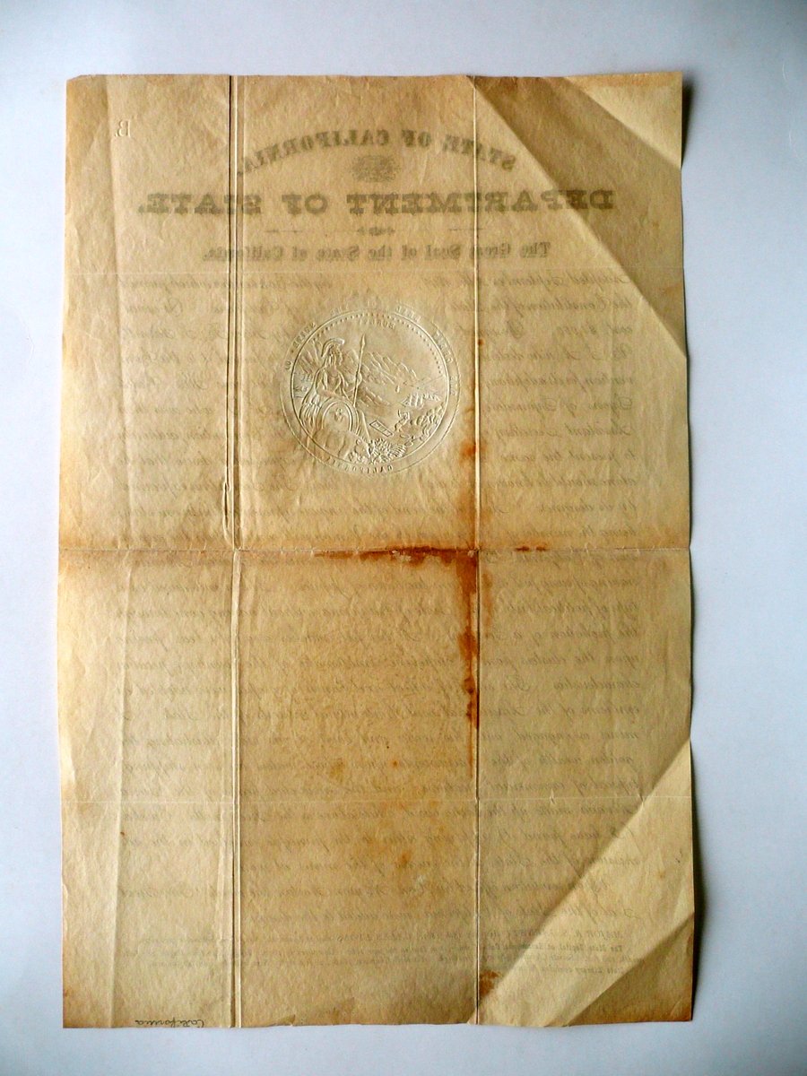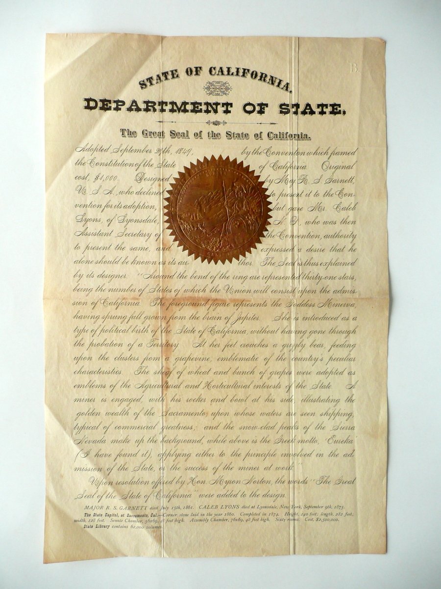 Documento fac - simile, State of California Department of State - The great Seal of the State of California Mancanza dei dati tipografici, s. d.; fac - simile di documento storico a stampa su carta; parte sup. con bella grande riproduzione del sigillo dello Stato della California (USA), dorato e in rilievo. Cm45x29. Testo in inglese. Condizioni di conservazione Esemplare in buone condizioni con tracce d'uso, pieghe di conservazione; due angoli con qualche lieve traccia di piega; retro con qualche minuscola e poco visibile traccia di precedente applicazione al margine sup. e in corrispondenza della piega centrale di conservazione; qualche circoscritta leggera ingiallitura (vedi foto). Fac - simile di documento storico nel quale viene descritto il sigillo dello Stato della California. Alla parte superiore vi è una bella riproduzione del suddetto sigillo. Testo in inglese. SC03.D10694 N