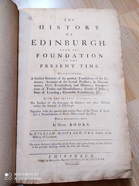 MAITLAND WILLIAM. THE HISTORY OF EDINBURGH, FROM ITS FONDATION TO THE PRESENT TIME.IN NINE BOOKS. Edinburgh, Hamilton 1753.[Fig. Scozia] (cm.36,5) legatura in pelle dell' '800, danneggiata piatti staccati.-- pp. VIII, 518. Con una grande pianta della citt‡ di edimburgo pi˘ volte ripiegata (cm.65x45) e 17 tavv. f.t. sempre incise in rame con panorami, castelli, stemmi, architetture ecc. Prima edizione figurata. Esemplare completo della carta 175/6 ricorretta e aggiunta all' originale. Si trovano esemplari con un numero diverso di tavole, probabilmente aggiunte dopo la prima tiratura. pianta della citt‡ con restauri posteriori, minime consuete ombreggiature, ma buon esemplare marginoso escluso la legatura guasta. -- GRAESSE IV 347; BRUNET III 1327.[f22]