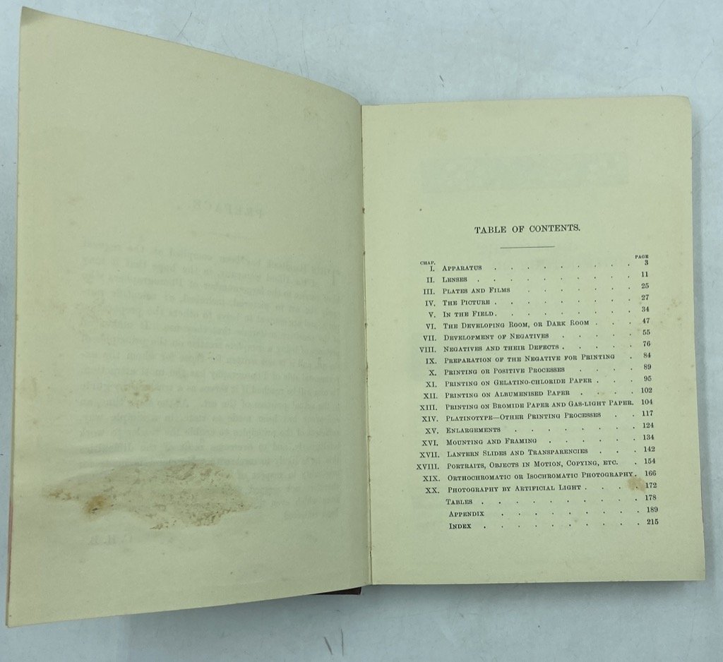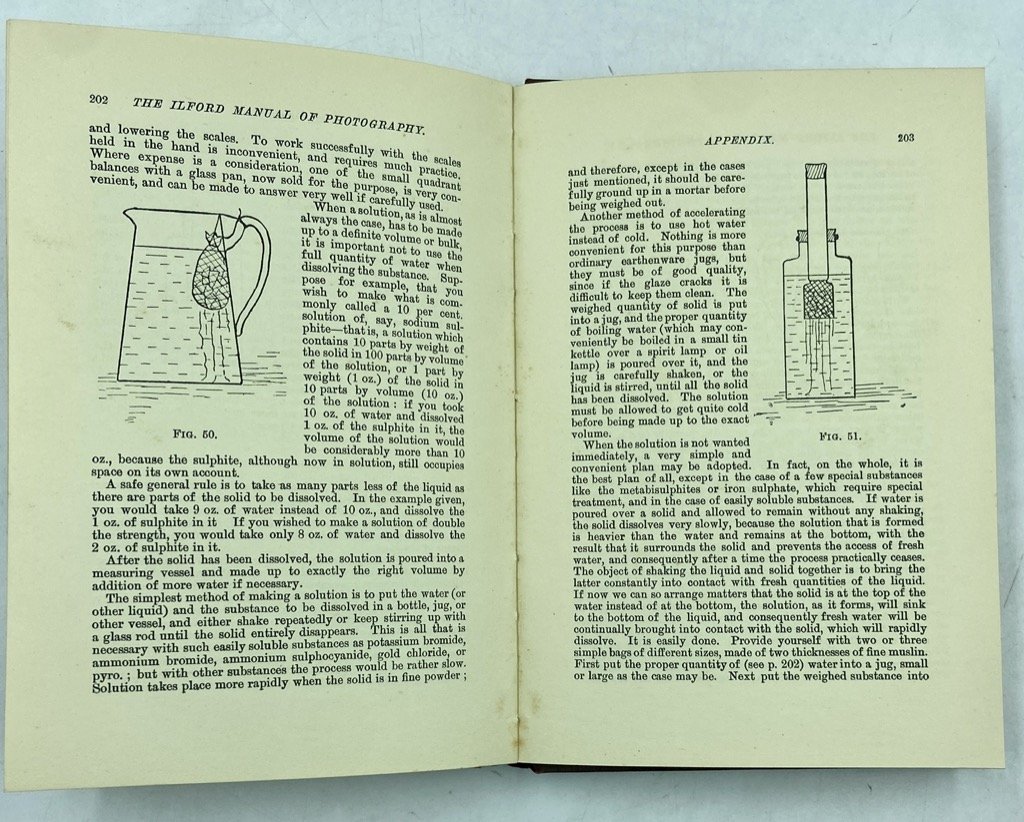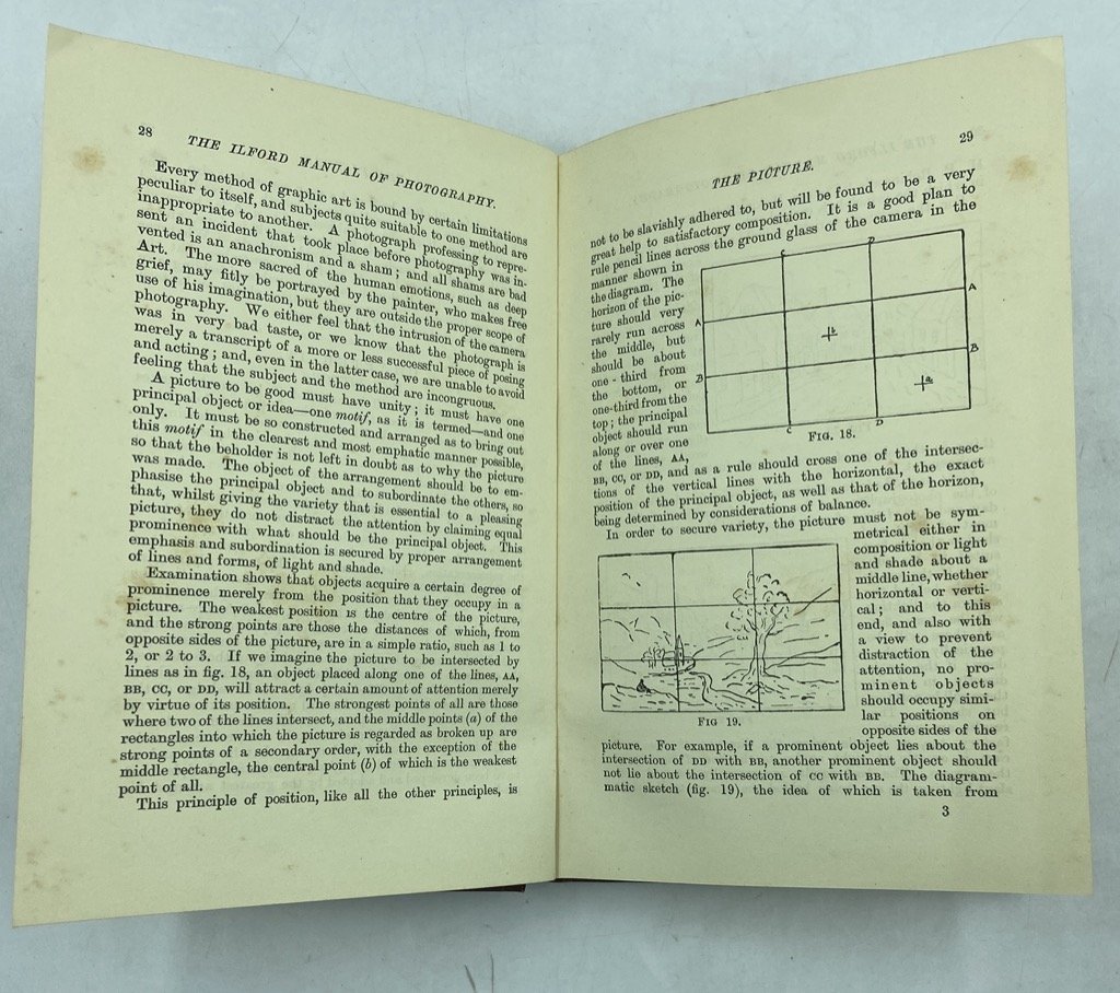 Tela editoriale con titoli dorati, cm 18.5 x 13, pp 218 con 50 figure in nero nel testo + pp 16 di Price List di Ilford in fine. Testo in inglese. Manuale di fotografia commissionato dall’azienda fotochimica inglese e più volte ristampato; istruzioni su ripresa, sviluppo e stampa, incluse tecniche quali albumine, bromuro e altre dell’epoca.