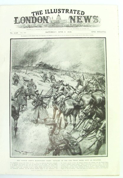 Features: Title page illustration of French Cavalry on the Oise Front; Two pages of illustrations of Royal visit to 'Khaki Country' - among the mills of the West Riding; Reserves and Their Employment (article); The Patron Saint of the Allies (article); Concerning National Kitchens (article); Photos of events in Italy, Portugal, Greece and France, including two photos of the funeral of Sister G.M.M. Wake, a Canadian nurse killed by a German bomb; Article on current events by G.K. Chesterton; Photos of John Robert Clynes, M.P., Sir Richard David Muir, The Duke of Rutland, Sir William James Tatem, and Sir John Merry Le Sage; Text and two illustrations describe the American's First "Big Thing" in France - The Cantigny Fight; The Moral and Material Effect of Bombing Germany (article by C.G. Grey); Six photos of British and U.S. Observers training Aerial Gunnery together; Wonderful 11-photo spread over two pages of the United States Army at the front where it is 'taking a gallant share in resisting the German offensive; Three illustrations and text describe the shelling of Paris from 74 miles by German super-gun "Long Bertha"; Seven photos of Sea-Warfare mementos from Zeebrugge - war museum additions; Centrefold illustration "The Last of the Albert Madonna - British Artillery In Action Near The Town; Photos of injured German POWs; Article on the saving of clerical labour; Two half-page aerial photos illustrate a British air attack on the main railway station at Metz; Roll of Honour - photos of 18 officers including Lieut.-Colonel James Hugh Coles, D.S.O.; Several lovely car ads; Fantastic two-colour back cover ad for "Erasmic" The Dainty Soap features well-dressed lady in boudoir studying her mirror; and more. 36 pages including several pages of marvelous vintage ads, most of which are illustrated. Unmarked with average wear. Binding intact. A sound copy of this excellent WWI-era issue. Magazine