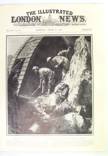 Features: Title page illustration of a tank stuck in Palestine; Wonderful two-page photo spread illustrates "Men's Work and Women's Work - In England, Ireland, France, and Palestine; The Reappearance of the Zeppelin (article); The Power of the Press - A Complete Journalist (article); Occupied by the Germans - The Aaland Islands (article); Page of six photos regarding Hong King's new Tai Tam Tuk dam and reservoir; Article by G.K. Chesterton includes photos of Sir George Alexander, John Dillon, and Canon Scott Holland; Five photos of the wrecked stained glass of Rheims Cathedral, and related salvage work; Six photos entitle 'Underground on the British Front' illustrate activites in subterranean tunnels and rooms; The New Air Force and Its Future - article; Before and after aerial photos of Merckem in Flanders which was destroyed by shells; Fantastic page of illustrations and text presents some ingenius food substitutes used by 'our ill-fed foes'; Centrefold illustration of British mine-sweeper protecting a neutral cargo ship from a drifting surface mine; Four wonderful half-page photos of the terrain of the Palestine Campaign - a land of wadis, sands and foliage; Fabulous one-page photo of the Mayor of Jerusalem coming out to surrender the city to General Allenby - meeting the first British outposts; Wonderful one-page ad for Beecham's Pills features lady fortune-teller with big hair, crystal ball and playing cards; Nice two-colour back cover ad for Greys cigarettes features illustration of two mounted soldiers circa 1742 in Mitre or Grenadier cap; and more. 36 pages including several pages of marvelous vintage ads, most of which are illustrated. Unmarked with average wear. Binding intact. A sound copy of this excellent WWI-era issue. Magazine