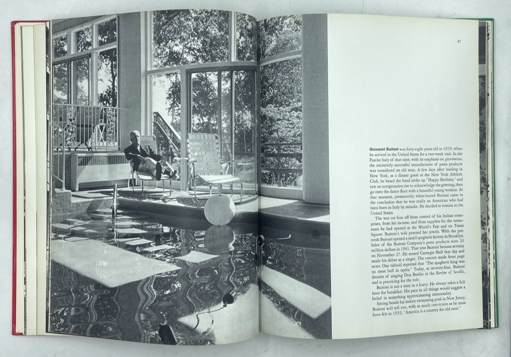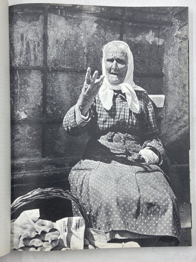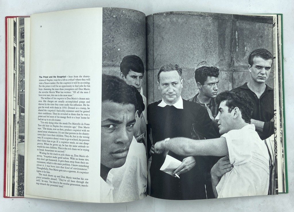 Cartonato editoriale, cm 29 x 22, pp 142, fotografico in nero. Testo in inglese. Prima edizione, seconda stampa (agosto 1965 - la prima è di giugno); impresso a Lucerna da C. J. Bucher. Monografia sull’Italia e gli italiani di John Phillips, uno dei padri del fotogiornalismo, figura cosmopolita e giramondo, amico di Saint-Exupéry, fotografo per Life con importanti reportage sulla seconda guerra mondiale, i conflitti in Palestina, la Yugoslavia, la realtà manicomiale a Verona. In questo libro il fotografo, «not an Italian - but that wasn’t his fault», sposato con un’italiana e assiduo frequentatore del bel paese, offre una panoramica dell’Italia del boom economico attraverso una sessantina di ritratti di Italiani più o meno celebri: Danilo Dolci, Sophia Loren, Gio Ponti, Gianni Agnelli, Massimo Campigli, Roberto Longhi, Cesare Maestri, Wally Toscanini, Enzo Ferrari, Lucio Piccolo… accanto a pizzaioli, artisti di strada, becchini. Il volume raccoglie testi e fotografie dell’autore; il lavoro di camera oscura è di Vittorio Mazza e la fotoincisione di Emil Buhrer, il progetto grafico di Franco Grignani; introduzione di Cornelius Ryan.