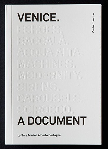 Venice. A Document -- There is an area between Venezia and Venice, between the reality and the logo, between the city and its brand. In this middle-earth conflicts rise frequently like fumes, clashes between truths and promises. In this space the imagination finds the humus needed to manifest itself. Here the two cities face off, mingle, declare war on a daily basis, they exchange the meaning of things and words. Only the stranger who lives in Venezia, remaining a stranger, can see this limbo; only by looking at Venezia in Venice and living the two dimensions with detachment can one understand The Possibility of an Island. — Testi: Marini Sara. Editore: bruno, 2015.
