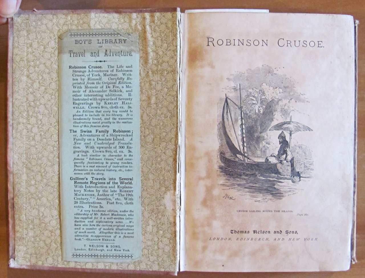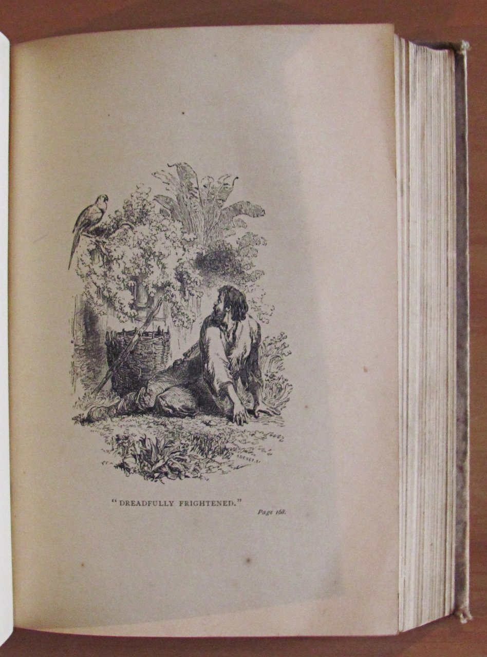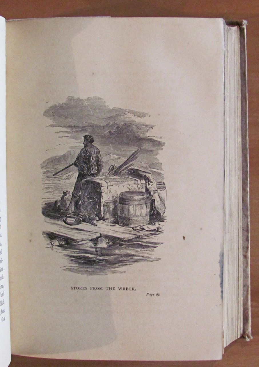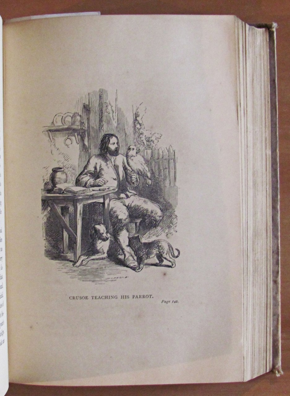 The life and strange surprizing adventures of Robinson Crusoe Of York, Mariner. Written by himself. 6 tavole in b/n f.t. Con segnalibro editoriale conservato. Ed. T. Nelson and Sons - London, 1886. Tela editoriale con lievi imperfezioni alle copertine a causa del rigonfiamento e sbiaditura della tela ai piatti. Peraltro interno freschissimo e pulito. 12,5x18; pp.593. Raro e in Buonissimo stato. , Molto buono (Very Good)