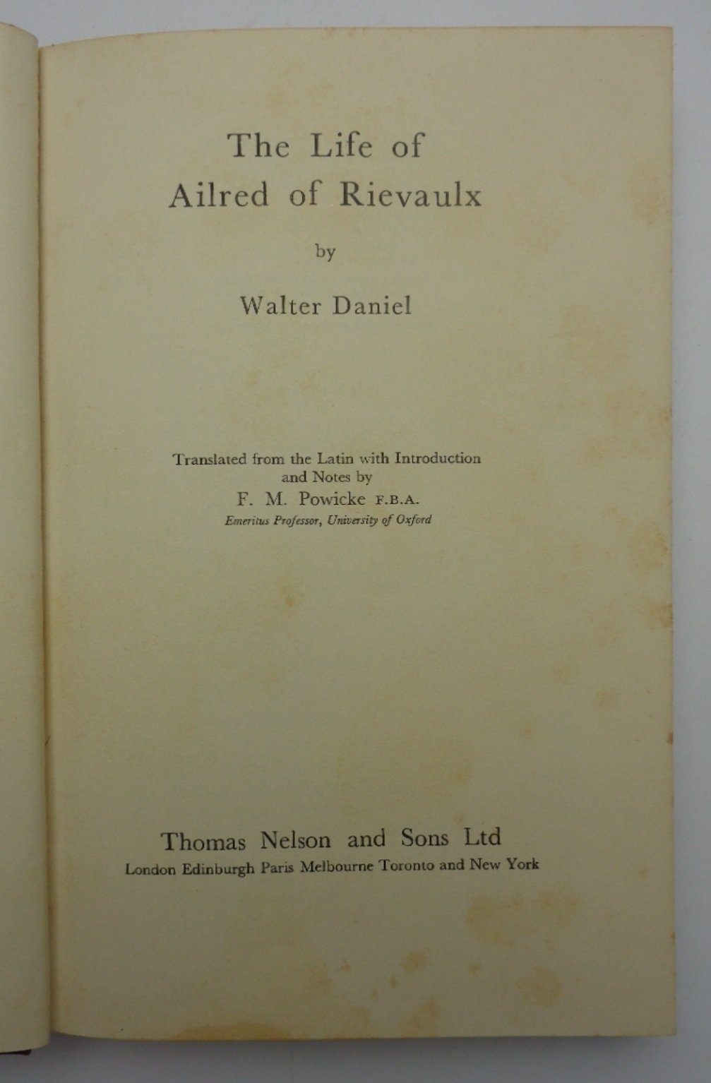Un volume (22 cm) di CII-81 pagine; con paginazione doppia: ogni due pagine con testo latino a sinistra e traduzione inglese a destra. Segue 7pp di Appendices e Index. Translated from the Latin with introduction and notes by F.M. Powicke. Una nota di possesso alla pagina bianca. Gora bruna all'angolo inferiore delle ultime quattro pagine. Tela editoriale bordeaux con titolo dorato al dorso. Buone condizioni.