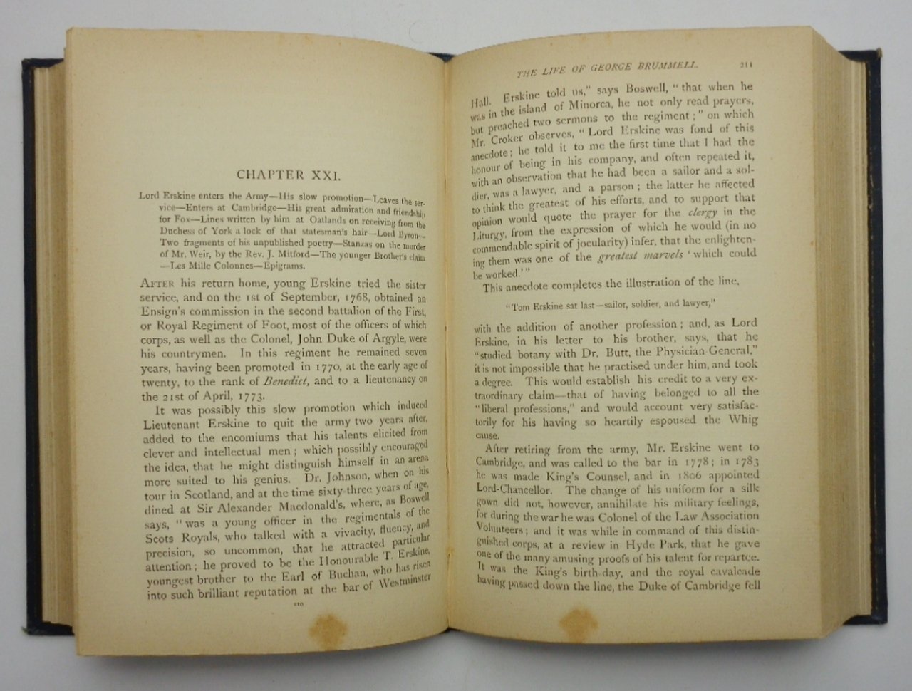 New Edition. Un volume di XIX-538 pagine, tela percallina blu con titolo dorato al dorso. MANCA la sovracoperta. Dimensioni: 15x22 cm. Lievi tracce d’uso alla legatura, rare fioriture (più presenti alle prime 10 e alle ultime 6 pagine), lievissima brunitura dei margini delle pagine ma nel complesso ottime condizioni interne. In lingua inglese. George Brummell è stato una figura di spicco nella società londinese della fine del XVIII secolo ed era un amico intimo del Principe Reggente, il futuro Re Giorgio IV, prima che tra i due sorgessero conflitti e problemi di debiti. Nel corso degli anni, Brummell è diventato oggetto di numerose rappresentazioni letterarie ed è considerato un esempio preminente di dandy, noto soprattutto per la sua avversione ai vestiti eccessivamente ornati, preferendo abiti su misura ben adattati. Dopo una narrazione cronologica della vita giovanile di Brummell, il Capitano Jesse approfondisce i suoi successi, l'influenza sulla società e le sue opinioni politiche, per poi concentrarsi su eventi significativi della vita di Brummell.