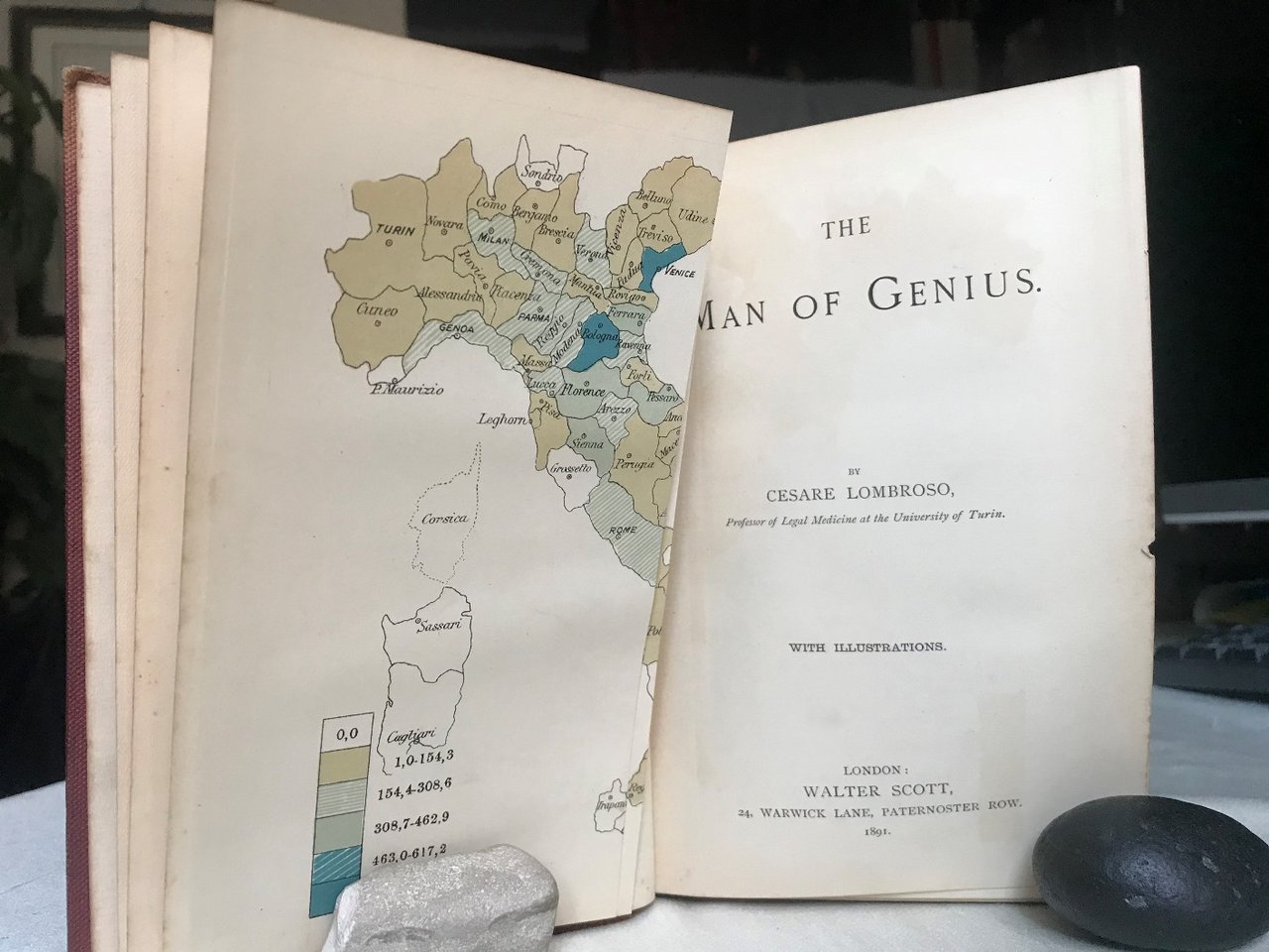 Volume in 8, tela editoriale, titolo al piatto impresso ed al dorso, sguardie (scritte a pennino), occhiello. tavola pi volte ripiegata con la collocazione statistica geografica in Italia (cartine dell'Italia settorialmente divise) di pittori e musicisti celebri, frontespizio, XVI, 370 pp., ulteriori 8 cc di pubblicit. L'opera principe di Lombroso su cui stata costruita la teoria antropologica criminale nella corretta e completa traduzione inglese. Importante, in ottimo stato, poco usuale.