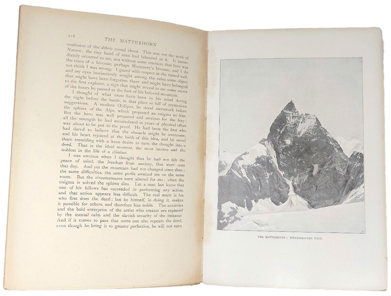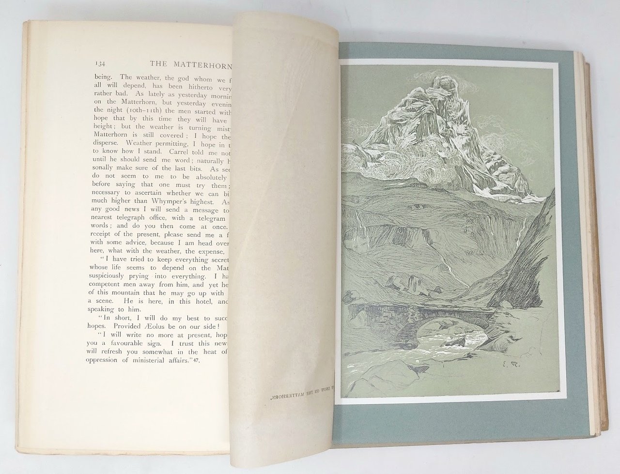 >in-8, pp. 336, legatura edit. t. tela, tass. in pelle con tit. oro al dorso. Prima edizione in inglese della celebre opera apparsa in italiano per la prima volta nel 1904 col titolo ''Il Cervino'', corredata di 35 tavole f.t. in tricoromia e 13 illustraz. n.t. L'autore (1861-1935, imparentato con i Sella, fu personalità di spicco nel mondo dell'alpinismo piemontese a cavallo dei secoli XIX e XX; scrisse vari libri e compì numerose scalate, la più celebre delle quali fu sicuramente la conquista del Furggen sul Cervino nel 1899. Ottimo esemplare. Perret 3664, note: «Il s'agit non seulement d'un ouvrage de référence sur le sujet, mais également d'un chef-d'oeuvre de la littérature alpine...». Neate R25. ACL p. 256.