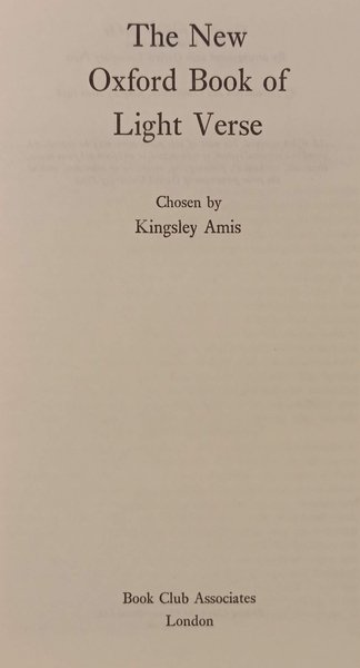 Copertina Rigida con sovracoperta<BR>Condizioni Ottime<BR>Lingua Inglese<BR>382 pagine. 22 x 14 cm. Antologia che celebra una ricca e piacevole tradizione della scrittura inglese. La scelta delle poesie riflette la grande varietà di versi leggeri così come i gusti e le opinioni del suo illustre editore. Le selezioni spaziano dalla satira geniale ai versi senza senso, dagli epigrammi ai limerick. Più di 250 poesie di circa 80 autori forniscono un'analisi spiritosa e costantemente divertente dei versi inglesi da Rochester e Ben Jonson ad Anthony Powell e Philip L