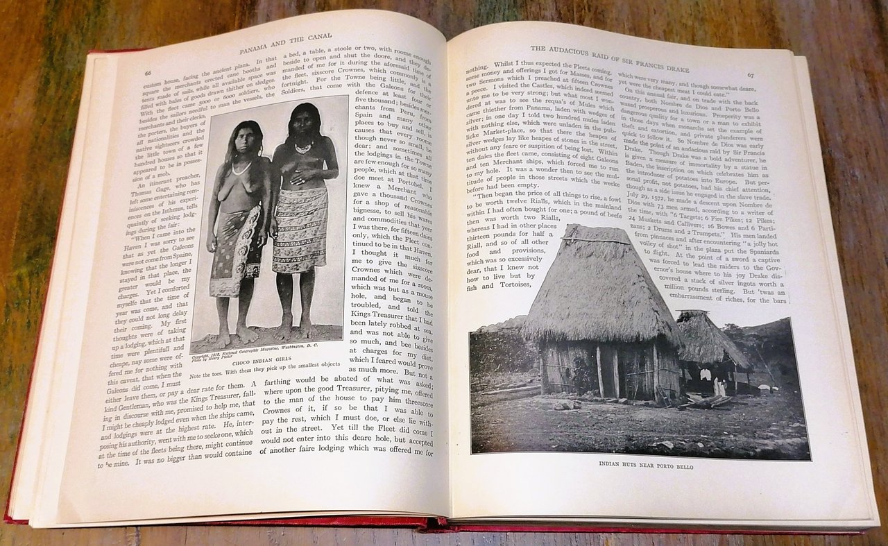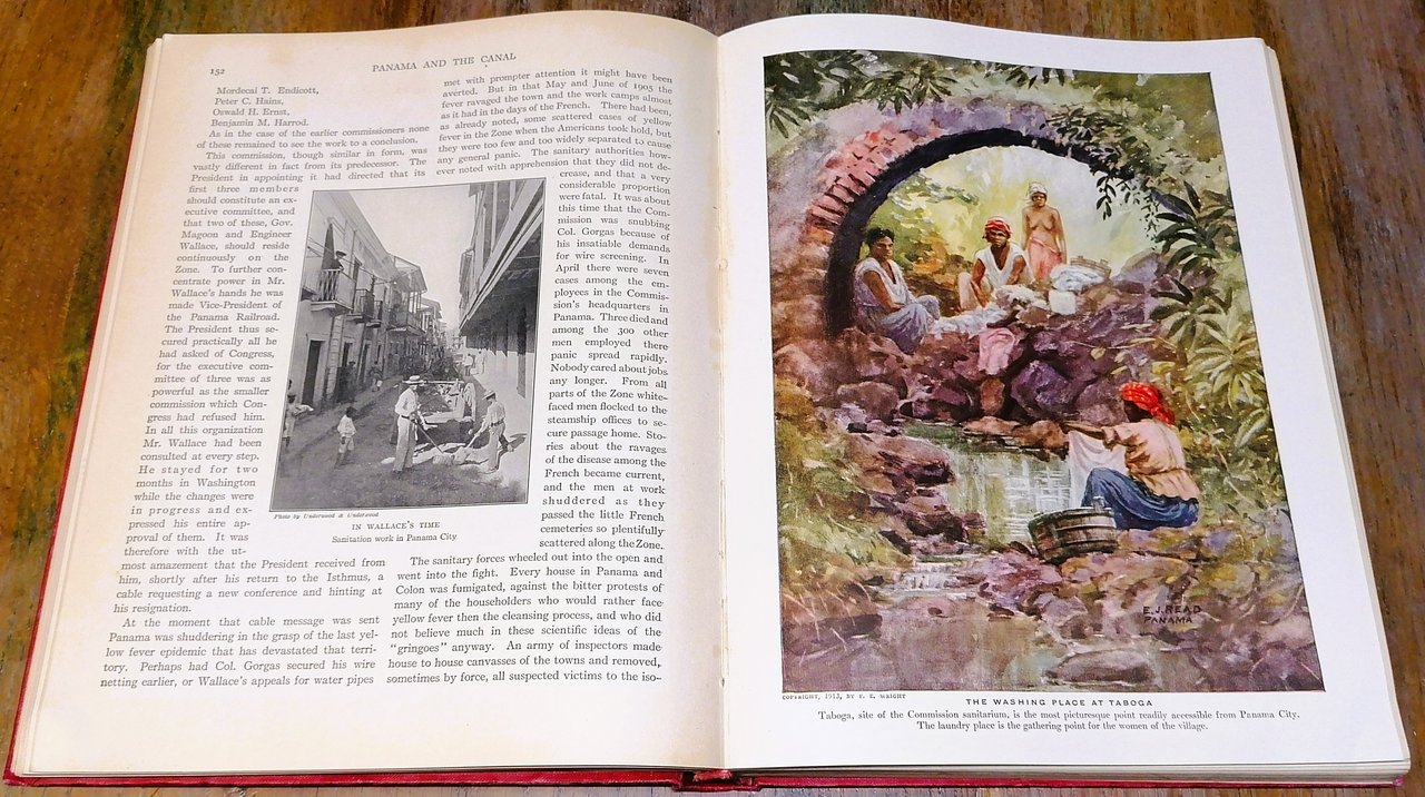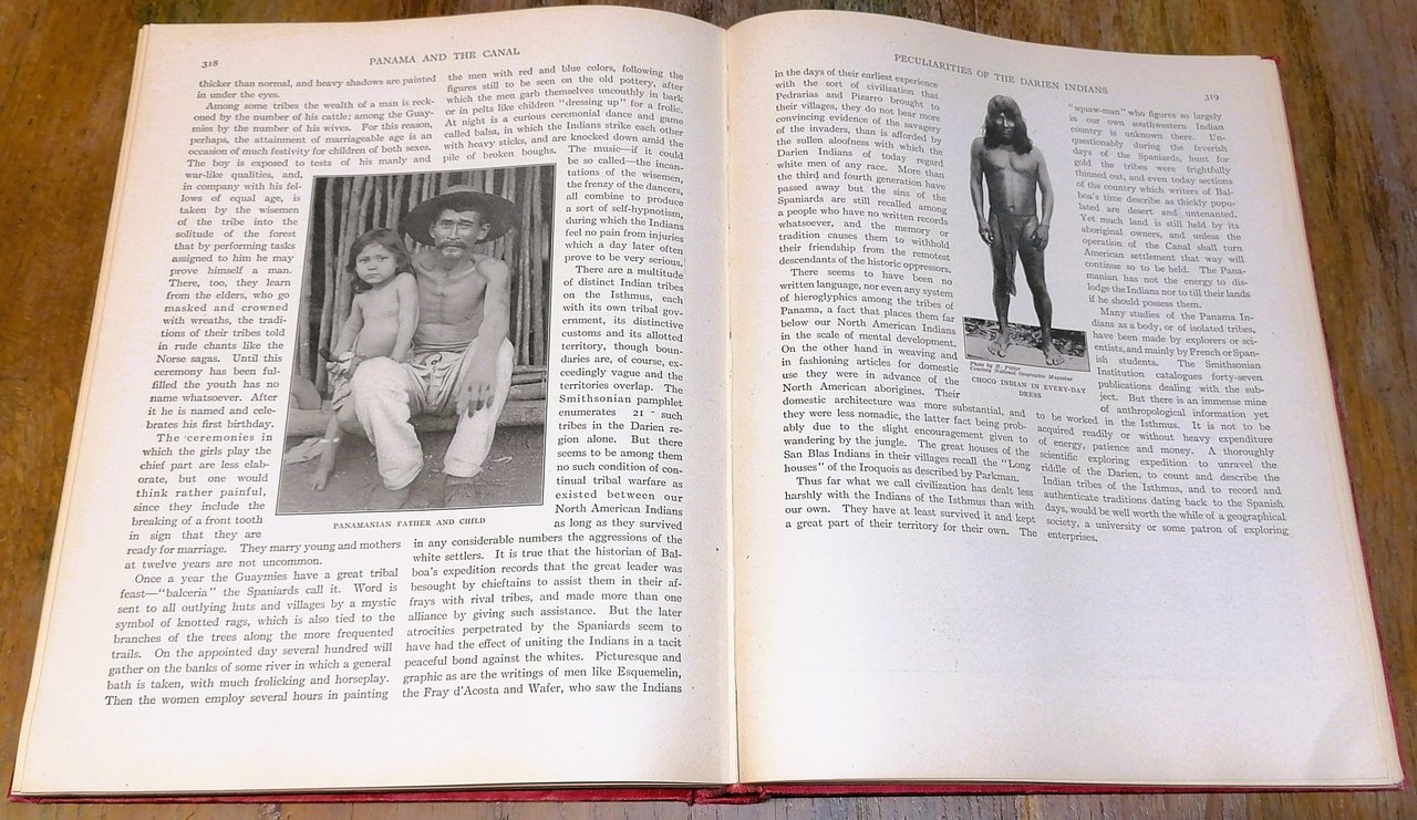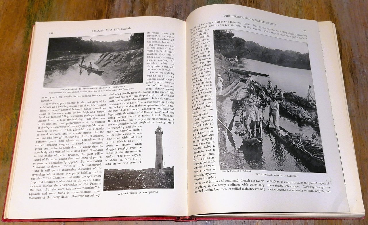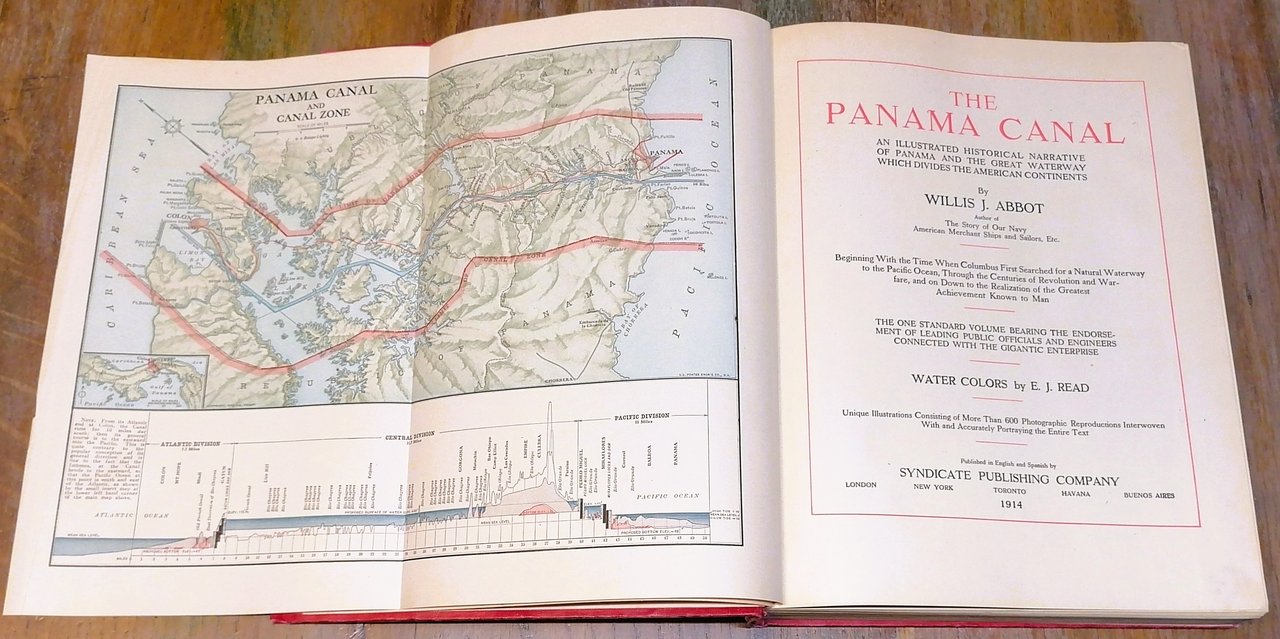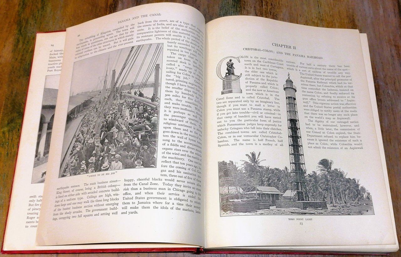 (Canale di Panamà - Centro America) In 4° piccolo (cm 29,5 x 22,5), bella legatura editoriale in piena tela rossa con titoli e ricche impressioni figurate policrome, pp. (2),414,(2), con una carta geografica ripiegata a colori (Panama Canal and Canal zone) in antiporta, 600 illustrazioni fotografiche in bianco e nero nel testo e 16 tavole fuori testo con disegni a colori di E. J. Read. Ottimo stato di conservazione.