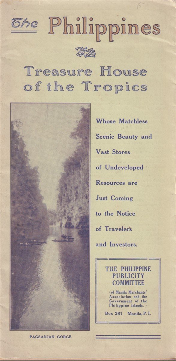 Light wear to pages. ; A booklet folded in half with 12 double-pages. Front cover with an illustration from a photograph of Pagsanjan Gorge. With a description of a 10-day-trip on flaps. Contains descriptions and illustrations of the major sights. The rear cover contains an illustrated article about the Cigar industry. ; Oblong 8vo 8" to 9" tall; 12 pages