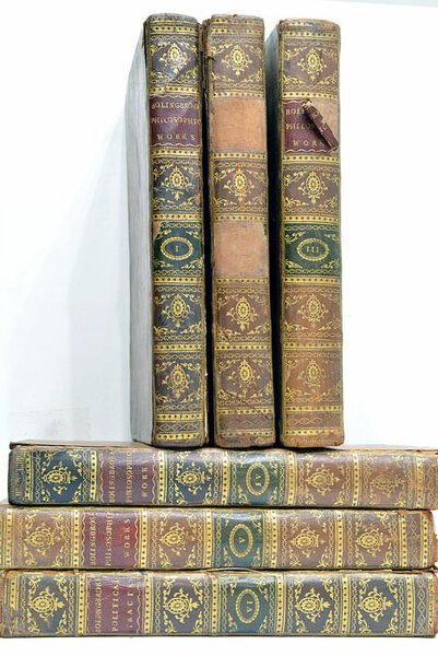 6 volumes. portrait. 2 feuillets. 358 pages. (i.e. 360). + 2 feuillets. 155 pages. 2 feuillets. pages 157-412 (les pages 173-176 n'existent pas). + 3 feuillets. 425 pages. + 2 feuillets. 398 pages. + 2 feuillets. 379 pages. + 2 feuillets. 388 pages. 4 feuillets. (21,5x13,5 Cm). Plein veau brun, dos lisses ornés. Quelques défauts et traces d'usure. Plusieurs charnières affaiblies et fendues. La pièce de titre manque au second volum. Coins et coiffes émoussés. Plats frottés. Premier plat du tome 6 presque entièrement derelié. Première Edition Collective des travaux philosophiques du diplomate et homme d'état Henry John, Vicomte de Bolingbroke. Ces écrits furent notamment remarqués par Voltaire, qui en notera la mérite. Le sixième volume, qui ne fait pas partie de l'édition, est intitulé "A Collection of Political Tracts. By the author of the dissertation upon parties", London, Davies, 1769. Ce dernier ouvrage porte quelques rousseurs. Assez bon ensemble, intérieurement bien conservé. Portrait gravé de l'auteur en frontispice.