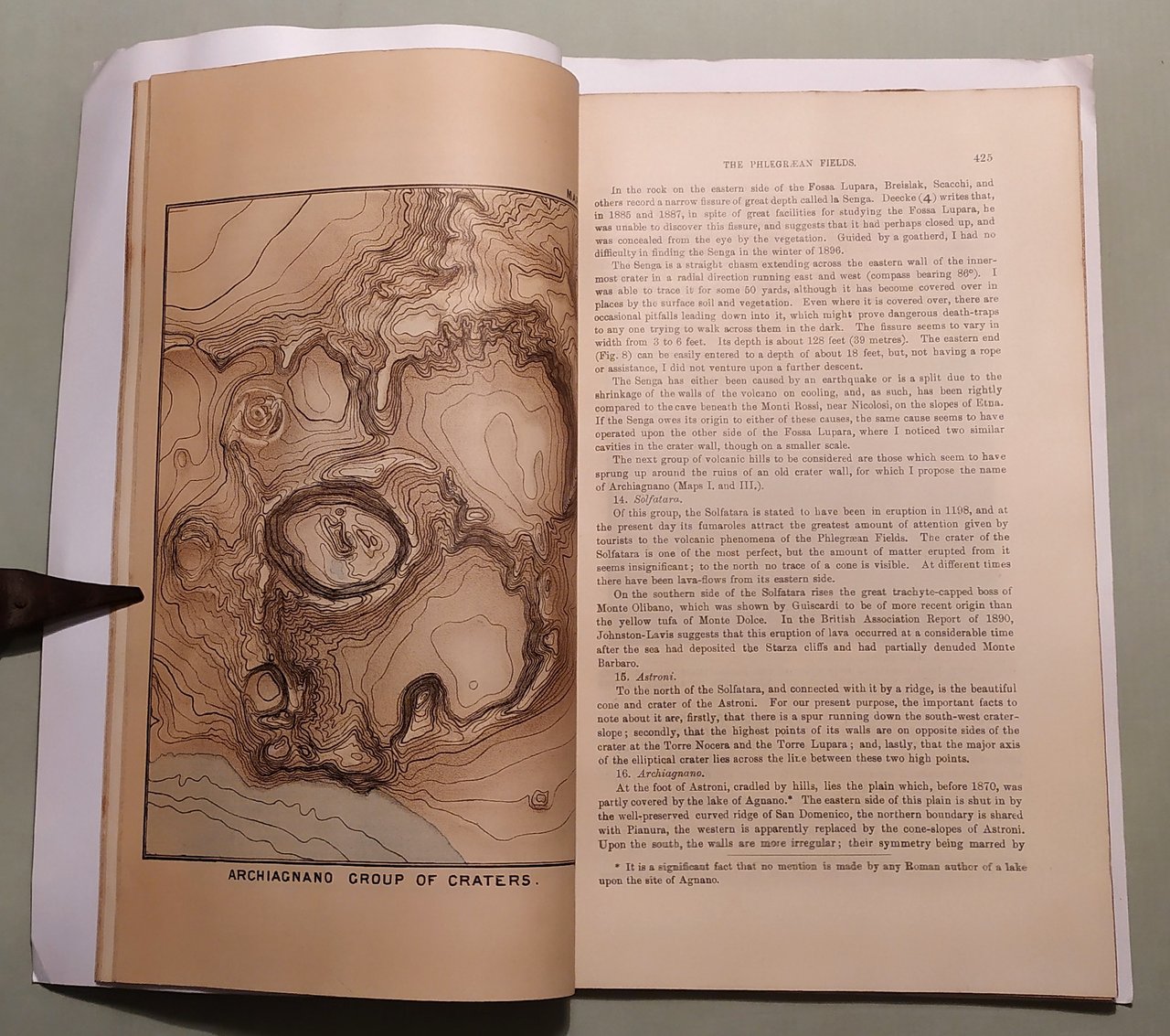 Estratto dal "Journal of the Royal Geographical Society", da pag. 412 a pag.500. London, 1897. In 8vo; pp.88 e 7 tavole fuori testo di cui 4 più volte spieghevoli. 15 illustrazioni in bianco e nero nel testo. Bross. Le caratteristiche geologiche e vulcaniche dei Campi Flegrei. R.T. Gunther, Magdalen College, Oxford: "I was elected to the Oxford Geographical Studentship for 1895-6 on March 14, 1895, for the purpose of enabling me to carry out certain investigations on the physiological features of the Phlegrean Fields, near Naples".