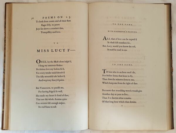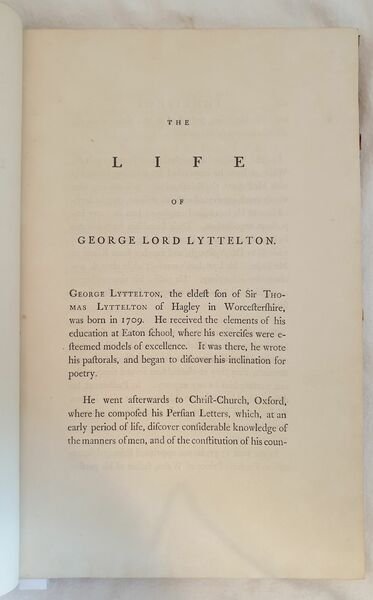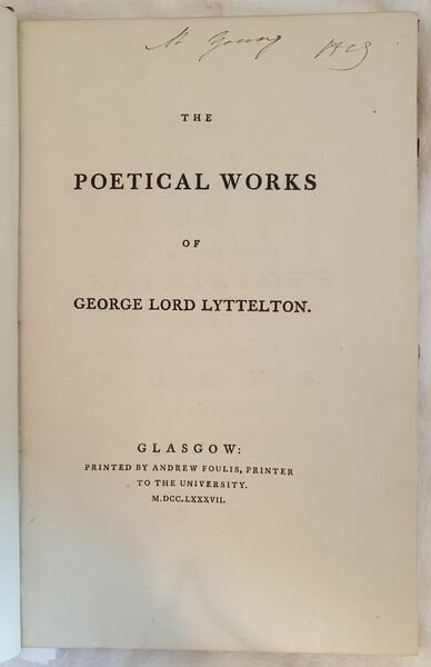 Finissima edizione del 1787 di questa raccolta di opere poetiche del nobile e politico inglese George Lord Lyttelton (1709-1773). Antica firma al frontespizio. Legato insieme in fine le opere poetiche di James Hammond (1710-1742) L'opera è in un volume ed è completa In ottime condizioni. Copertina in mezza pelle con ricche decorazioni in oro al dorso in buone condizioni con lievi usure ai margini e dorso. Rottura al dorso. Legatura in ottime condizioni. All'interno le pagine si presentano in ottime condizioni con rare fioriture In folio. Dim. 38x25 cm. Pp. XV+(1)+IV+130+(4)+VIII+III+(3)+45+(3). Peso Kg. 1,581Very fine edition of 1787 of this colelction of poetical works by the english politican and nobleman George Lord Lyttelton (1709-1773). Ancient signature in the title page. In the end of the volume the poetical works of James Hammond (1710-1742) The work is in one volume and it is complete <BR>In very good conditions. Half leather cover with rich golden decorations in the spine in good general conditions lightly worn in the edges and spine. Crack in the spine. Binding in very good conditions. Inside pages are in very good conditions with occasional foxings. In folio. Dim. 38x25 cm. Pp. XV+(1)+IV+130+(4)+VIII+III+(3)+45+(3). Peso Kg. 1,581