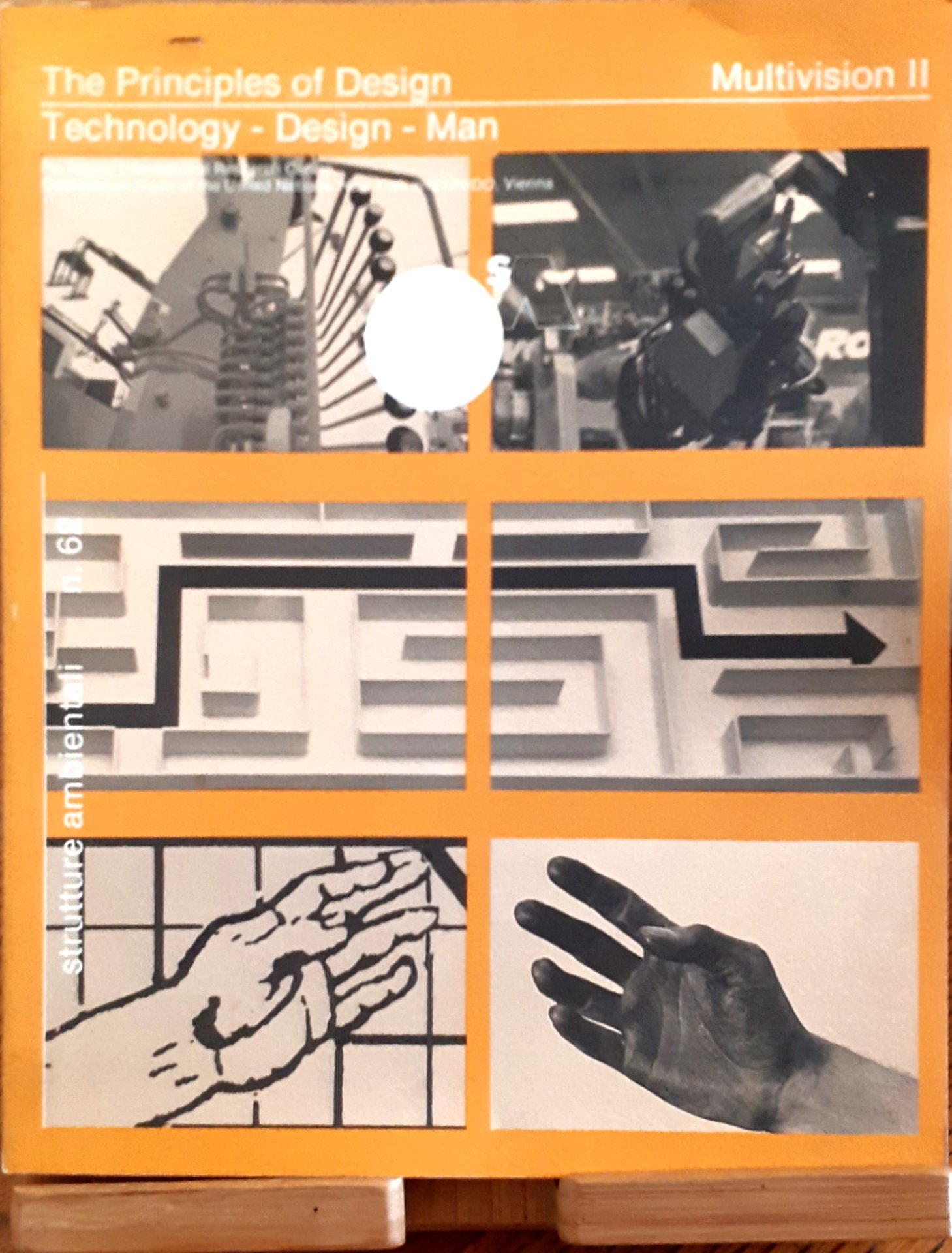 Periodico quadrimestale The Principles of Design" (Multivision II) facente parte di "Strutture Ambientali" n. 62. A cura di: Gerardo Filiberto Dasi, Segretario Generale del Centro internazionale ricerche sulle strutture ambientali "Pio Manzù" di Verucchio (RN), Renato Di Nubila (questa edizione), Paola Dasi. Volume contenente il testo e una selezione di slides di una presentazione multimediale prodotta da "Rat für Formgebung" (Design School of Darmstadt, West Germany), rivolta agli Istituti di Design (Idea: Ulrich Kern/Rudolf Schönwandt; Photography: Ad Berger; Music: Volker Kriegel; AV Technician: Thomas Fischer; Realisation: Eckhard Neumann; Technical Direction: Herbert Ohl). Testo in inglese (trad. Christina Tolaini). In-8, pp. 56, bross. Illustrazioni in b/n nel testo. Copertina aranncione con illustrazioni in nero. Stato buono"
