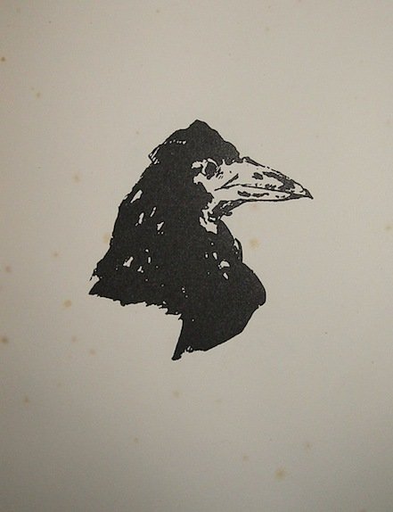 Folio (cm. 38,6), 48 pp., 2 cc.nn. con un disegno del corvo e il ritratto dell’Autore. Brossura editoriale. Lievi fioriture, ma ottimo esemplare. Edizione della prima tiratura di 50 esemplari fuori commercio in numerazione romana (nostro n. IL), in carta di Fabriano ‘Umbria’. Furono editate anche 312 copie destinate alla vendita in carta Fabriano ‘Miliaflex’. Provenienza: Biblioteca Ungaretti: dedica autografa alla prima carta bianca di Ettore Serra a Geanne e Peppino Ungaretti, datata primo aprile 1945. Opera rara.