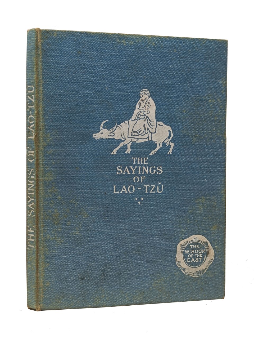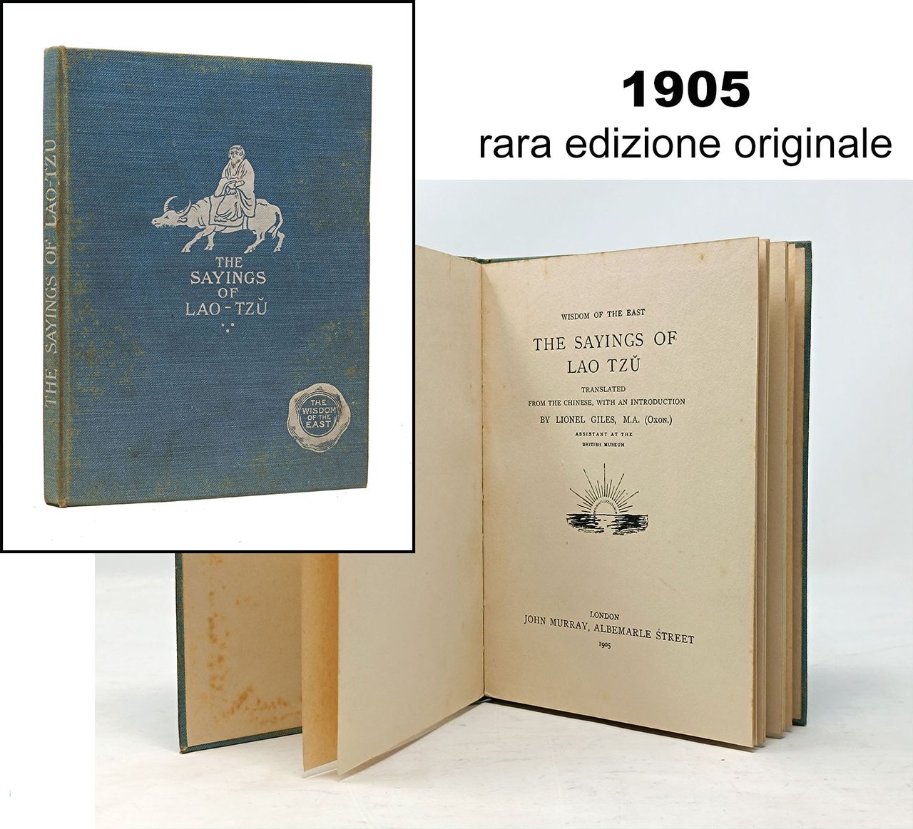 'The sayings of Lao Tzu' translated from the chinese, with an introduction by Lionel Giles, M. A. (Oxon.). Editore: John Murray, London. Serie: Wisdom of the east series (edited by L. Cranmer-Byng, Dr. S. A. Kapadia). Anno: 1905. Lingua del testo: inglese. Pagine: 53 + [5]. Formato: 12,5 x 17 cm circa. Stato di conservazione: leggere scoloriture sulla coperta, retro delle copertine e pagine ad essi frontali ingiallite, rare e piccole macchioline gialle ma, nel complesso, un esemplare decisamente buono. Privo di timbri, firme di appartenenza, annotazioni, sottolineature o altri segni nel testo. Copertina editoriale cartonata rigida in tutta tela azzurra con incisione e titolin impressi in bianco sul piatto e sul dorso. Raccolta dei pensieri di Lao Tzu, filosofo cinese del V secolo a.C., fondatore del taoismo. Figura avvolta da un alone di mistero in quanto non si conosce con esattezza nè il nome nè le vicende che caratterizzarono la sua vita (Lao Tzu non è che un soprannome che significa vecchio 'Lao' ragazzo 'Tzu'). Rara edizione originale di un opera molto ricercata.