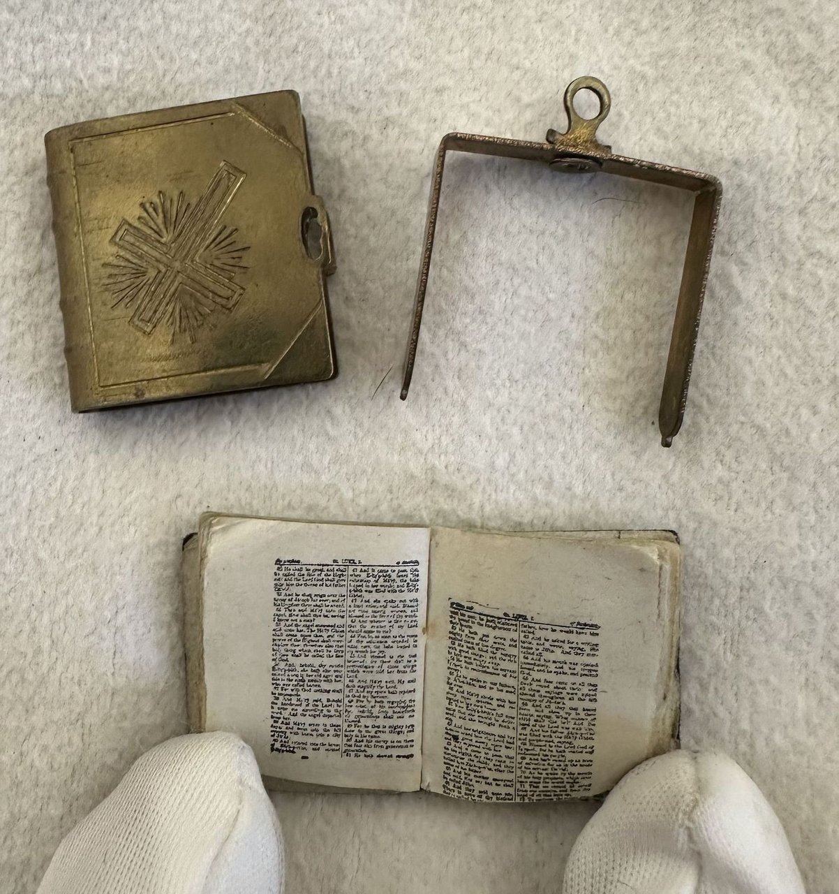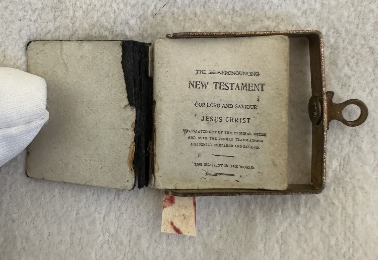 Pregiato volume in miniatura (mm 25x22), Il Nuovo Testamento del nostro Signore Gesù Cristo, la Bibbia della Chiesa Protestante. Senza data ma dei primi del novecento. Copertina custodia in metallo con ricche decorazioni e chiusura con la chiave (non funzionante). All'interno sono presenti tre illustrazioni a piena pagina che mostrano scene bibliche. In discrete condizioni. Copertina in metallo con decorazioni al piatto anteriore in ottime condizioni con lievi usure marginali. Meccanismo di chiusura non funzionante. Legatura in buone condizioni ma corpo del libro staccato dalla copertina. Pagine in buone condizioni. In 32. Dim. 25x22 mm. Pp. 224.Precious volume in miniature (mm 25x22), the New Testament of Our Lord Jesus Christ,. Not dated but of early 20th century. Metal cover with rich decorations in the front plate and closure with key (not working). Inside there are three out of text illustrations showing bible scenes. In fair conditions. Metal cover with decorations in the front plate in very good conditions lightly worn in the extremities. Closure mechanism is not working. Binding in good conditions but the body of the book detached from the cover. Pages in good conditions. In 32. Dim. 25x22 mm. Pp. 224.