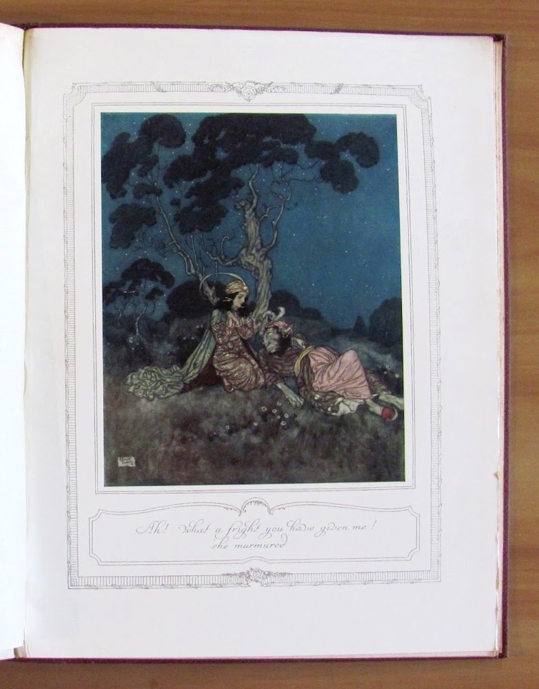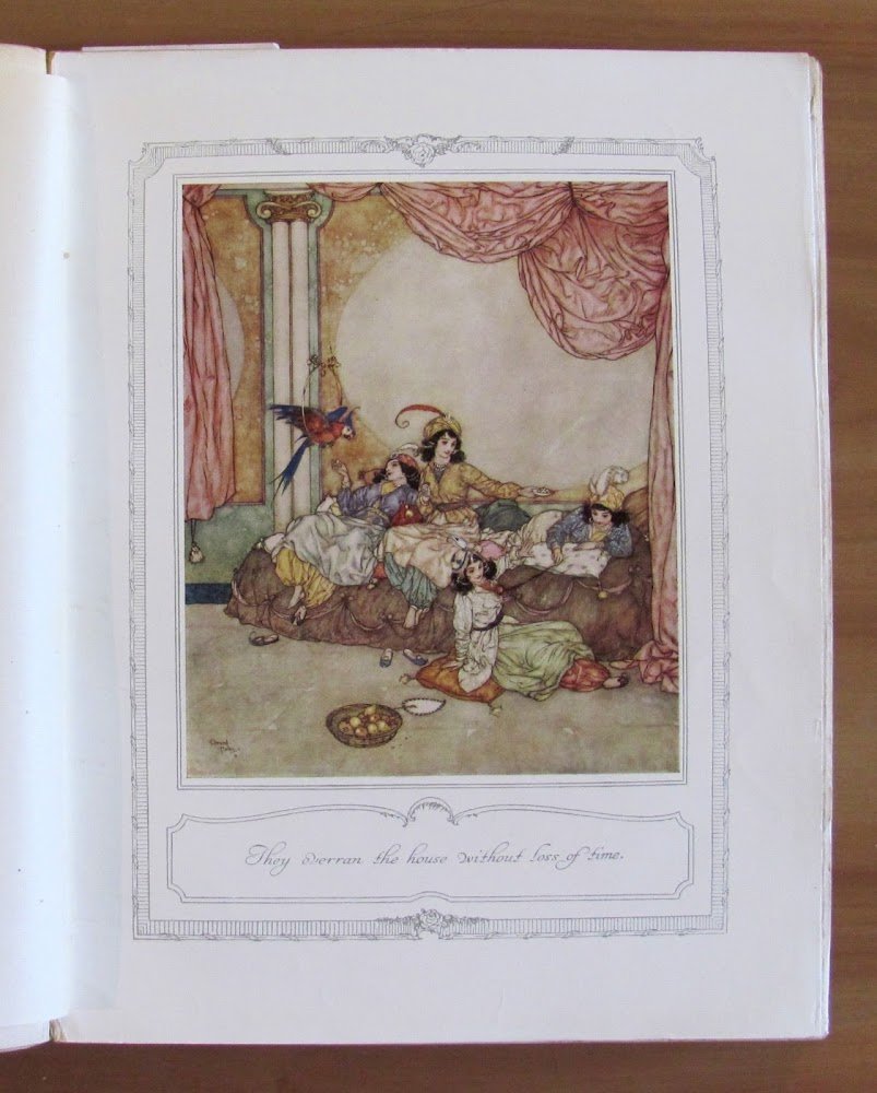 From the Old French. 30 splendide tavole a colori applicate f.t., tutte protette da velina muta, di Edmond Dulac. Hodder & Stoughton - New York, I edizione s.d. 1910 ca. Tela editoriale finemente decorata in oro, con titoli, al piatto e al dorso e impressioni a secco in retrocopertina. Piccolissima dedica del tempo in antiporta e lievi e sporadiche fioriture in qualche pagina. Il margine esterno di sole due tavole presenta delle piccole impefezioni con taglietti. 22,5x28,5; pp.128. Raro e in Ottimo stato.