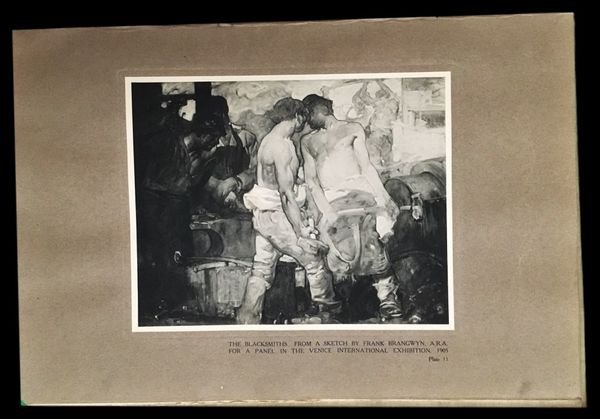 In folio (41,5×28,4); 22, (2) pp. e 20 c. di tav. che presentano, fra le altre, quattro tavole cromatiche montate su carta grigia, dodici "Rembrandt photogravures", 5 xilografie (descritte nella parte basso da testo) e quattro litografie. Da segnalare le tavole originali di Brangwyn: "Brickmakers at Work" una litografia a due colori su carta patinata montata su cartoncino, stampata da Thomas Way; "A Cooper at Work" una litografia b/n su carta color crema, montata su cartoncino, stampata da Thomas Way; "The Steam Excavator" stampato in ocra rossa su carta color crema, montata su cartoncino. Sempre su disegno di Brangwyn "Making a Railway Cutting" una litografia in terrad'ombra su carta color crema. Legatura editoriale con titolo impresso in amaranto al piatto anteriore. Leggere tracce di polvere. Alcune minime macchioline di foxing e bruniture nella parte di testo, del tutto ininfluenti e praticamente invisibili e nel complesso in buone condizioni di conservazione. L'opera, stampata in una ricercatissima veste grafica, con varie testatine, iniziali e finalini animati intercalate nel testo, riporta gli scritti di Walter Show Sparrow e Leonce Benedite. Il volume rappresenta un'importante panoramica dedicata al lavoro del celebre artista anglo-gallese, Sir Frank William Brangwyn (12 maggio 1867 - 11 giugno 1956) che fu pittore, acquerellista, incisore, illustratore e designer fra i più innovatori del suo tempo. Abile intagliatore fu un abile litografo ed illustratore di libri e durante la sua vita artistica produsse quadri, litografie, xilografie ma anche disegni per vetro colorato, mobili, ceramiche, vetri da tavola, edifici e interni. Pur essendosi formato artisticamente inizialmente nella bottega di William Morris alle dipendenze di Arthur Heygate Mackmurdo, fu principalmente un autodidatta. Particolarmente sensibile alle immagine della modernità ritrasse spesso immagini legate al mondo dell'industria, del commercio, dei lavoratori allo stesso modo esaltando la potenza del progresso ma anche i lati cupi e negativi dello stesso. I suoi lavori sono caratterizzati da una forza dirompente. Ogni tavola dell'opera qui presentata riporta applicata su cartoncino, un lavoro di Brangwyn con un testo che ne descrive il titolo al piede di ogni opera.