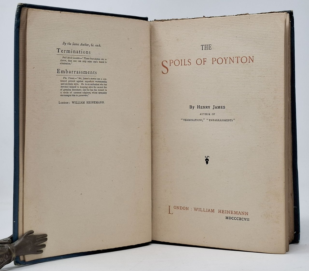 Prima edizione (stampata a Londra), in lingua inglese, del romanzo 'The Spoils of Poynton' di Henry James. Formato: 13,5 x 20 cm circa. Pagine: 286 + [34] di presentazione di altre opere della casa editrice. Stato di conservazione: piccole e superficiali abrasioni / scoloriture sui bordi della coperta, macchioline marroni (irrilevanti ai fini della lettura) sulle pagine frontali 16 - 17, 282 - 283, i bordi di alcune pagine si presentano frastagliati a causa di un taglio delle pagine (da intonse) non molto accurato, si segnala a questo proposito una mancanza dell'angolo superiore (parte bianca) del foglio che contiene le due pagine 237-238 (il suddetto angolo è infatti rimasto attaccato al foglio successivo), tagli sul rivestimento del piatto posteriore (in corrispondenza della linea della rilegatura) ma, nel complesso, un esemplare buono. Privo di firme d'appartenenza, timbri, annotazioni, sottolineature o altri segni di penna o di matita. Rilegatura editoriale cartonata rigida in tutta tela di colore celeste, caratterizzata da quattro iris incisi sul piatto anteriore. Titoli in oro impressi sul piatto anteriore e sul dorso. Da collezione.