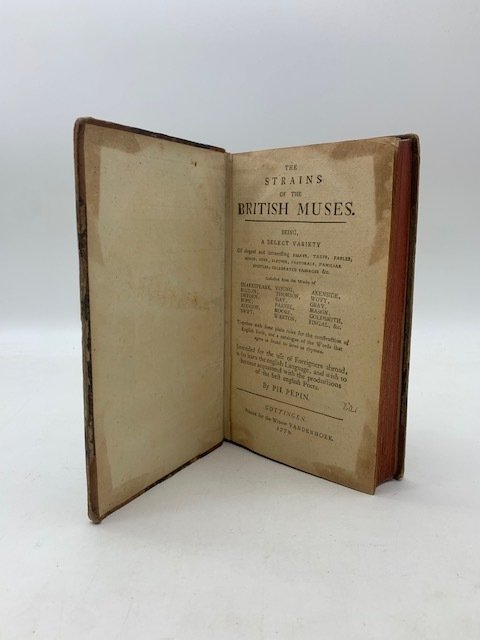 In 8 (cm 12 x 20,5), pp. (30) + 474. Lieve alone brunito ai margini del frontespizio e dell'ultima carta. Legatura in mezza pelle coeva con qualche abrasione ai piatti. Edizione originale, molto rara, di questa antologia letteraria inglese contenente una selezione di opere di 18 autori principali e vari altri fra i quali (citati al frontespizio): Shakespeare, Milton, Dryden, Pope, Addison, Swift, Young, Thomson, Gay, Parnel, Moore, Warton, Akenside, Woty, Gray, Mason, Goldsmith, Fingal. L'antologia fu curata da Philip Pepin, successore di John Tompson all'Università di Gottingen (Tompson aveva precedentemente curato nel 1737 le fortunatissime “English Miscellanies”, poi ristampate in tre successive edizioni). Proprio come il suo predecessore, citato da Pepin nella prefazione, il curatore di questa nuova antologia si rivolge agli studenti stranieri di lingua e letteratura inglese che, grazie a questo testo, avrebbero potuto esercitarsi nella comprensione della lingua oltre a poter fruire di una panoramica letteraria dei principali autori inglesi. In fine compare un catalogo di parole inglesi, con una serie di termini che rimano con queste, da utilizzare in poesia.