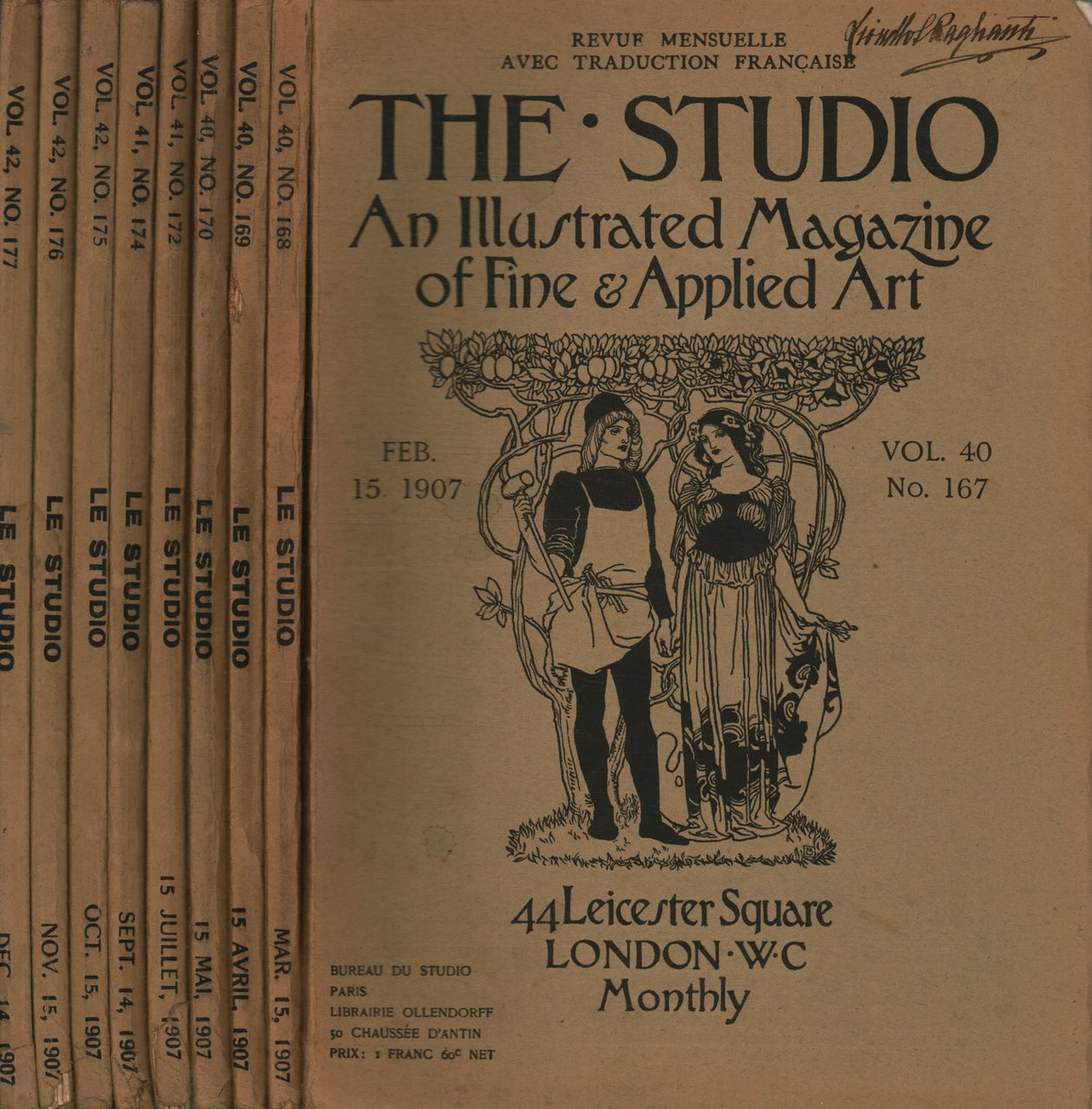 The Studio annata 1907 (9 fascicoli): vol. 40 n. 167 febbraio, vol. 40 n. 168 marzo, vol. 40 n. 169 aprile, vol. 40 n. 170 maggio, vol. 41 n. 172 luglio, vol. 41 n. 174 settembre, vol. 42 n. 175 ottobre, vol. 42 n. 176 novembre, vol. 42 n. 177 dicembre