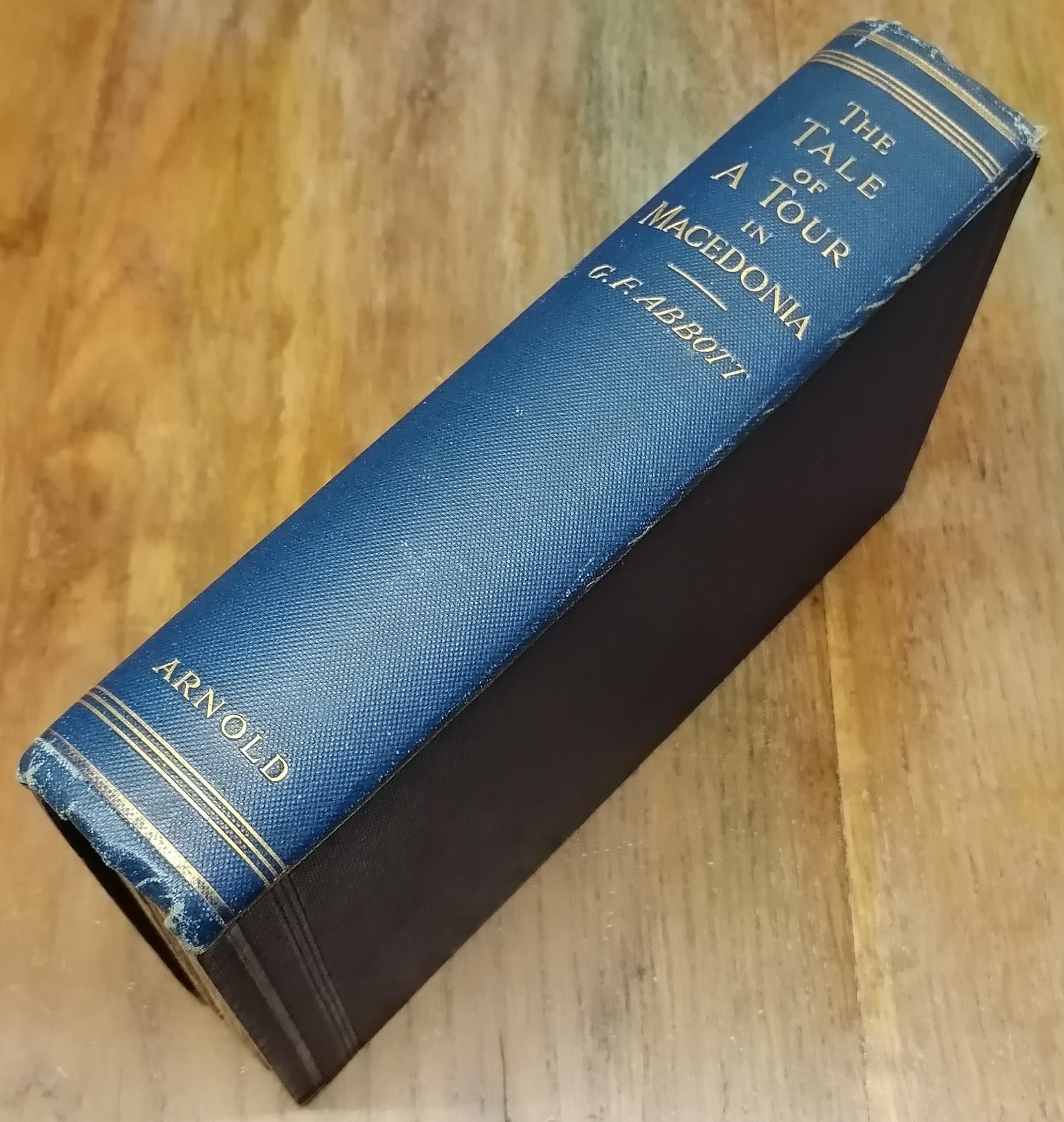 (Viaggi; Macedonia; Penisola balcanica; Impero ottomano; Folklore; Etnografia; Europa sud-orientale) In 8°, legatura in piena tela editoriale blu con filetti e titoli impressi in oro al dorso, pp. X,(2),343,(1) + pp. 31,(1) di pubblicità editoriale, con 8 tavole fotografiche in b/n fuori testo di cui una in antiporta ed una mappa più volte ripiegata alla fine del volume. Legatura integra con lievi tracce del tempo, punti di ossidazione all'interno circoscritti ad alcune pagine ed ai fogli di guardia, dovuti alla porosità della carta usata, per altro buon esemplare. Relazione sulla missione di ricerca etnografica compiuta nel 1900 nella Macedonia ottomana, su incarico dell'Università di Cambridge, dallo scrittore e giornalista britannico G. F. Abbott. Prima edizione.