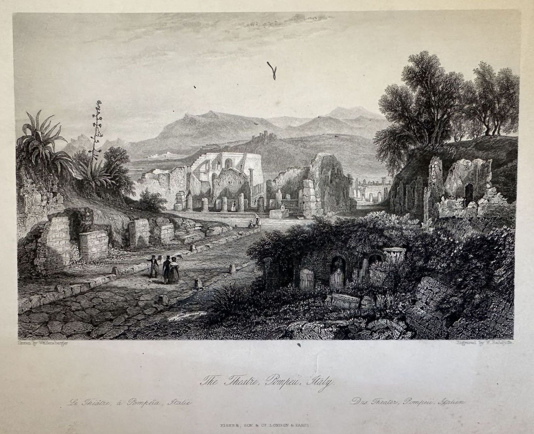 Veduta animata del 1840 circa del Teatro di Pompei. Autore: W. Radclyffe su disegno di Wolfens Berger Data: 1840 circa Tecnica: Litografia Dimensione del foglio: 285x210 mm Dimensione incisione: 190x125 mm Condizioni: Buone condizioni. Fioriture.Animated view of 1840 circa of Palazzo Doria in Piedmont coloured by hand with aquarello Author: De Engelmann after Villeneuve Date: 1840 circa Technique: Lithography Leaf Dimension: 285x210 mm Engraving Dimension: 190x125 mm Conditions: Good conditions. Foxing.