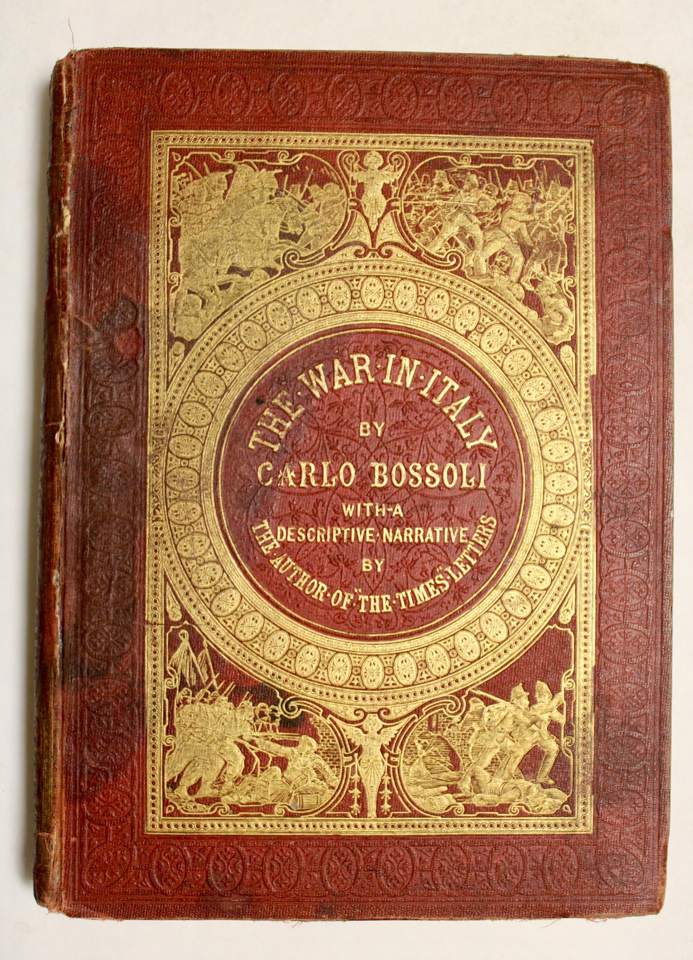 In 8° (mm 290x205); frontespizio, pagg. VIII, 72 con 40 tavole fuori testo in litografia a colori (la 39 dell'assedio di Peschiera in antiporta) e 2 carte delle battaglie di Magenta e Solferino nel testo iniziale.<BR>Legatura editoriale in percallina rossa con impressioni in oro raffiguranti scene di battaglia ed a secco a piatti e dorso, titolo in oro al piatto ed al dorso, tagli in oro. Le belle tavole sono delineate da Bossoli ed eseguite in litografia da vari autori <BR>Il ticinese Carlo Bossoli (Davesco Lugano 1815- Torino 1884) pittore, disegnatore e litografo, seguì l'esercito sardo nella guerra del 1859 e documentò con grande bravura gli episodi bellici salienti rendendo le scene con realismo e paesaggismo di buona fattura. Il testo è opera del colonnello magiaro Nandor Eber, corrispondente dalla Crimea per il Times di Londra. <BR>Discrete condizoni generali con qualche abrasione, macchia ed escoriazione alla legatura. Una piega al frontespizio, qualche ossidazione e fioritura all'interno. <BR>