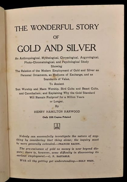 In 8°; 288 pp. e una pecetta di errata fuori numerazione che presenta anche una nota manoscritta (probabilmente dallo stesso Harwood). Legatura editoriale in tutta tela rossa con titolo impresso in oro al piatto anteriore ed al dorso. Prima edizione in tiratura limitatissima di 225 esemplari di questa storia delloro e dellargento e dei culti a lui collegati. Lopera ripercorre gli aspetti antropologici e le conseguenze economiche del legame delluomo con loro ed largento, attraverso i secoli e lo sviluppo delle società dallantichità fino allo sviluppo della modera economia. Edizione rarissima ed in ottime condizioni di conservazione. Rif. Bibl.: Princeton University Libraries ReCAP C-10 5679.
