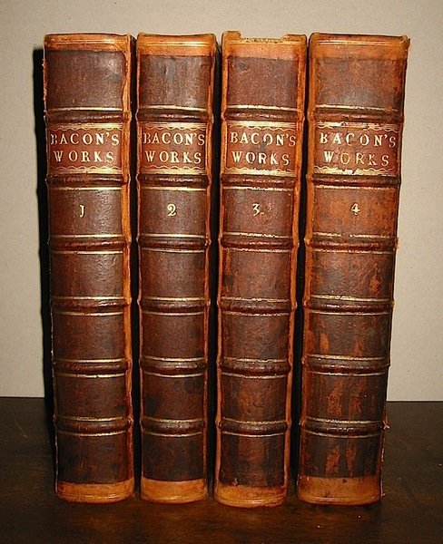 Folio (cm. 32), 4 Voll., 4 cc.nn., IV, LXXXII-394 pp., 19 cc.nn., 124 pp.; 2 cc.nn., 564 pp., 14 cc.nn.; 1 c.nn., 586 pp., 23 cc.nn.; 1 c.nn., 740 pp., 14 cc.nn. Inoltre tre antiporte incise f.t. e due tavv. rip. n.t. Assente l’antiporta con ritratto nel primo volume. Belle e solide legature coeve in piena pelle con nervi, fili e titolo oro al ds. Due fili oro incorniciano i piatti. Antichi restauri ben eseguiti alle cuffie, alle cerniere e agli angoli. Ingialliture della carta, ma, nell’insieme, esemplare in ottimo stato di conservazione di una delle edizioni più antiche delle opere di Bacone con alcuni scritti inediti e con la vita dell’A., scritta da Mallet, in prima edizione.