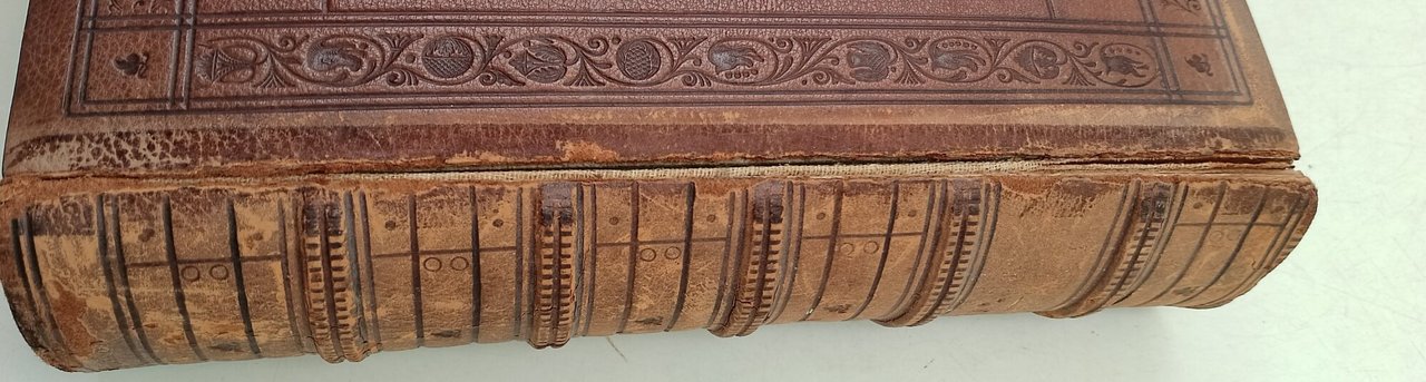 In 8', leg. in pelle, con nervi al dorso, e bassorilievi ai piatti, tagli in oro, risguardi con carta a motivi geometrici, pp. 490, XIV; piatto ant. staccato, cerniera del piatto post. fragile, abrasioni al dorso e tit. in oro sbiaditi, interni in buono stato, ordinari segni del tempo.