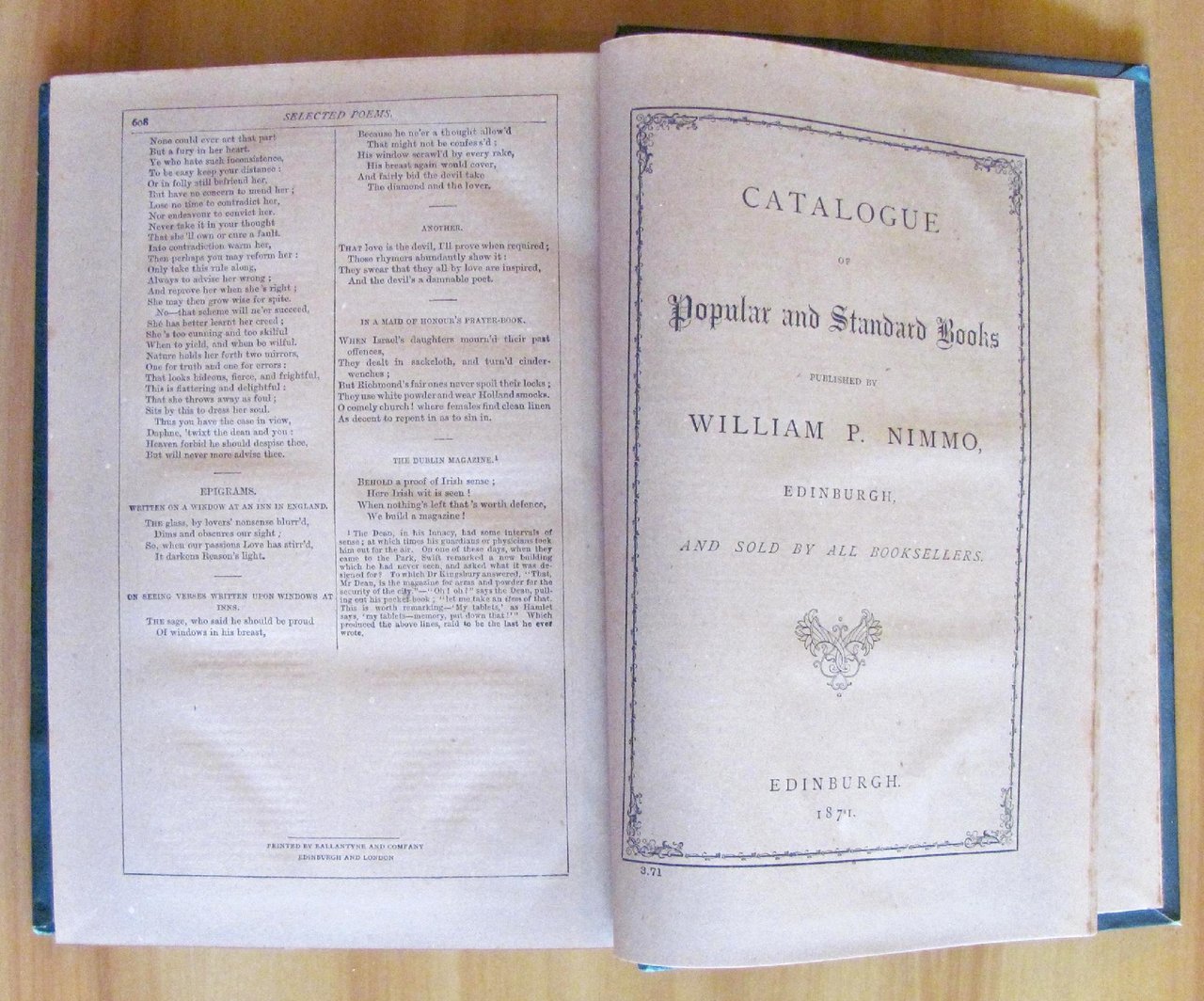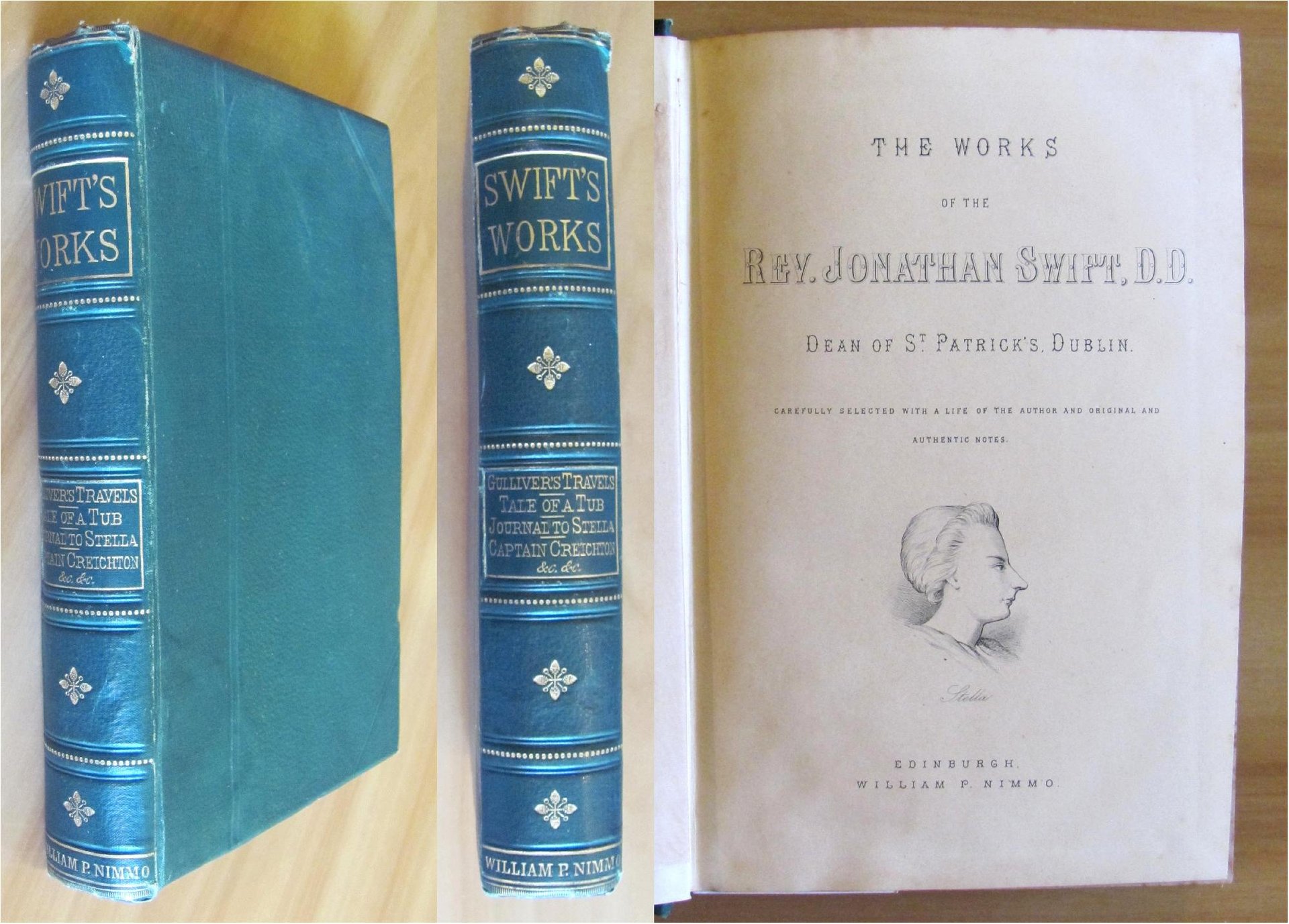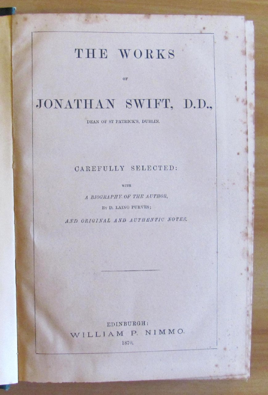 The Works of the Rev. Jonathan Swift, D.D. - Dean of St. Patrick's - Dublin. Carefully selected with a Biografy of the Author by D. Laing Purves and original and authentic Notes. Contiene: Gulliver's Travels; Tale of a Tub; Journal to Stella; Captain Creichton; Selected Poems ecc. ecc. 1 tavola f.t. in antiporta protetta da velina e una piccola illustrazione al frontespizio. Publ. William P. Nimmo - Edinburgh, 1870. Tela editoriale con titoli e fregi in oro al dorso. 17x24,5; pp.608 + 24 di Catalogo dell'Editore. Raro e in Ottimo stato. , Molto buono (Very Good)