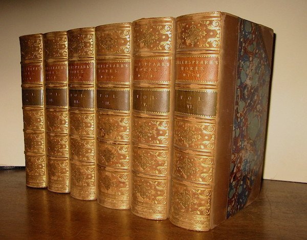 8vo (cm. 21,5), 6 Voll., XVII(1) pp., CCXVI-417(1) pp.; 4 cc.nn., 604 pp.; 4 cc.nn., 660 pp.; 4 cc.nn., 780 pp.; 4 cc.nn., 716 pp.; 4 cc.nn., 707 pp. Ritratto di Shakespeare in antiporta del primo volume (’From his Monument at Stratford’ engraved by Francis Holl). Belle legature coeve in mz. pelle con angoli. Nervi, ricchissimi fregi e titoli oro su doppio tassello al ds. Carte dei piatti, tagli e sguardie marmorizzate in maniera uniforme. Ex libris araldico ‘Francis Hugo Lindley Meynell’ ai contropiatti anteriori. Minime tracce d’uso alle legature, ma esemplare in ottimo stato di conservazione. Prima edizione dell’opera completa di Shakespeare a cura di A. Dyce (1798-1869). Raro.