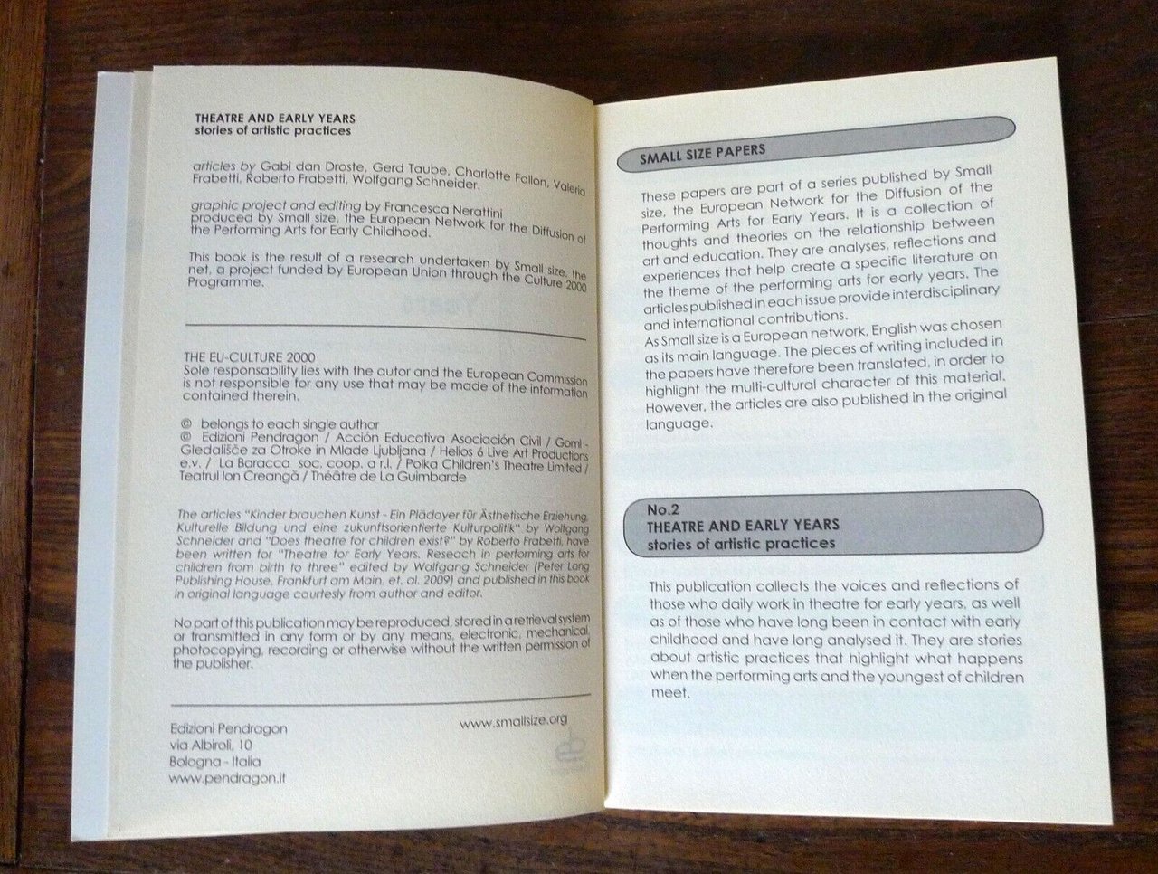 AA.VV.,THEATRE AND EARLY YEARS.STORIES OF ARTISTIC PRACTICES.Edizioni Pendragon, Bologna 2009,brossura, 21x14 cm., pp.127,collana SMALL SIZE PAPERS / 2,testi originali in tedesco, italiano, francese,con traduzione in inglese,ISBN: 978-88-8342-735-0,peso: g.250