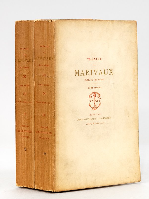 Un des 170 exemplaires sur Hollande numérotés, Théâtre Choisi de Marivaux publié en deux volumes par F. de Marescot et D. Jouaust, avec une préface par F. Sarcey, tirage sur grand papier orné d'un portrait de l'auteur, 2 vol. in-8 br., collection Nouvelle Bibliothèque Classique, Librairie des Bibliophiles, Jouaust, Paris, 1881, 2 ff. (faux-titre et titre), XXVII-299 pp. et 3 ff. n. ch. ; 2 ff. (faux-titre et titre), 346 pp. et 3 ff. n. ch. Complet. Bon exemplaire sur grand papier, au format in-8 (à ne pas confondre avec les tirages au petit format in-16). Vicaire, I, 628