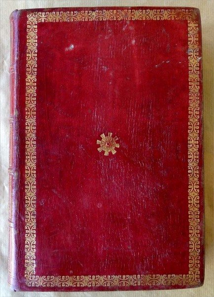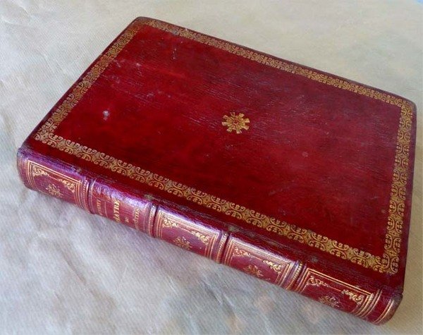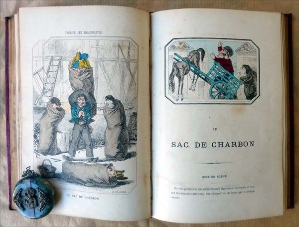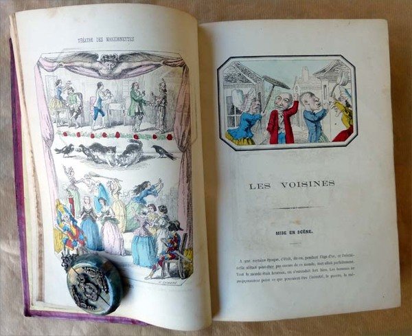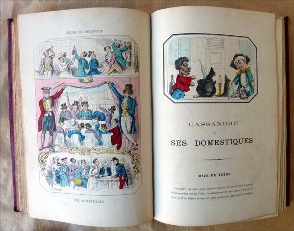 Un volume de format grand in 8° (25,5x17,5 cm); de 4 ff. (faux titre, titre, introduction illustrée); 390 pp.; nombreuses illustrations coloriées dans le texte. Vingt Quatre pièces décrites avec les personnages nécessaires au jeu. Reliure de l'époque en plein maroquin cerise; riche encadrement doré sur les plats décor au centre de chaque plat; dos à 4 nerfs; caissons dorés et ornés; titre doré; entièrement doré sur tranche. Bien que parfaitement relié, l'ouvrage a été manié: le maroquin est frotté par endroit; quelques pages ont des rousseurs; de petites salissures mais ce volume reste vraiment désirable. Voir les nombreuses photographies.Duranty écrivain reconnu créa le premier castelet en dur aux jardins des Tuileries. Ses décors avaient, à l'époque été peint par Courbet. Ces 24 saynettes mettant en scène Polichinelle, Pierrot, Arlequin furent écrites à l'origine pour George Sand.