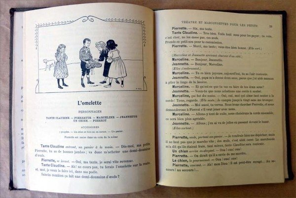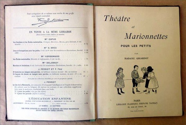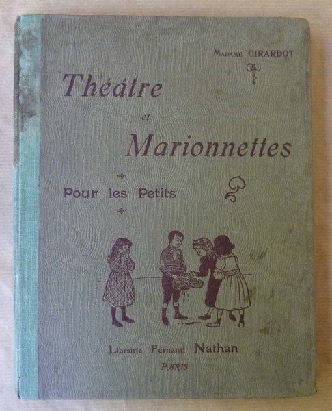 Un volume de format in 8° de 80 pp., un frontispice photographique; illustrations dans le texte de F. Fav. Reliure cartonnée de l'éditeur, dos toilé vert pomme, plat illustré. Couverture tachée; intérieur très frais. L'ouvrage contient 20 petites pièces de marionnettes pour maternelles. Voir les photos.