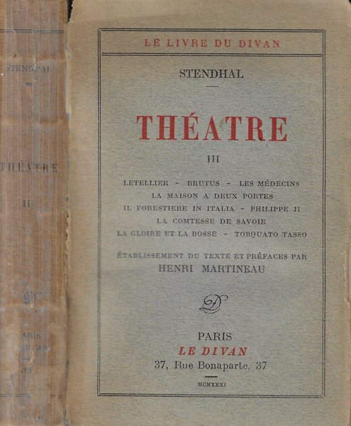 Opera incompleta, vol III e facente parte della serie Le livre du Divan. Scelta dei testi e prefazione di Henri Martineau. Brossura tascabile, in cartoncino, scurita e segnata dal tempo, con usura lungo i margini e scotch trasparente al dorso. Pagine ingiallite, con tagli irregolari, con legatura allentata in particolare nella parte centrale. Numero pagine 407.
