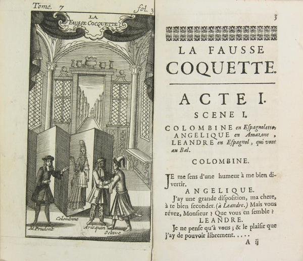 s.l, s.d. (fin 18è). In/12 reliure plein veau, dos à nerfs à caissons dorés et pièce de titre rouge, bois : frontispices pour chaque comédie, 402 pages. Manques aux coiffes, usures sur la reliure. Manque la page de titre et faux-titre. 5 comédies d’auteurs différents, jouées au Théâtre Italien de Paris : entre autres, "Le tombeau de Maistre André", une face crée au Théâtre des Italiens en 1695 s’inspire d’une fable de la Fontaine L’huitre et les deux plaideurs.