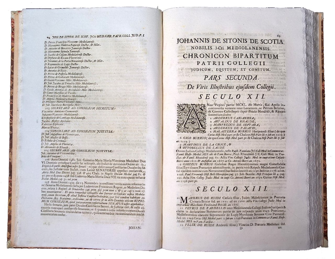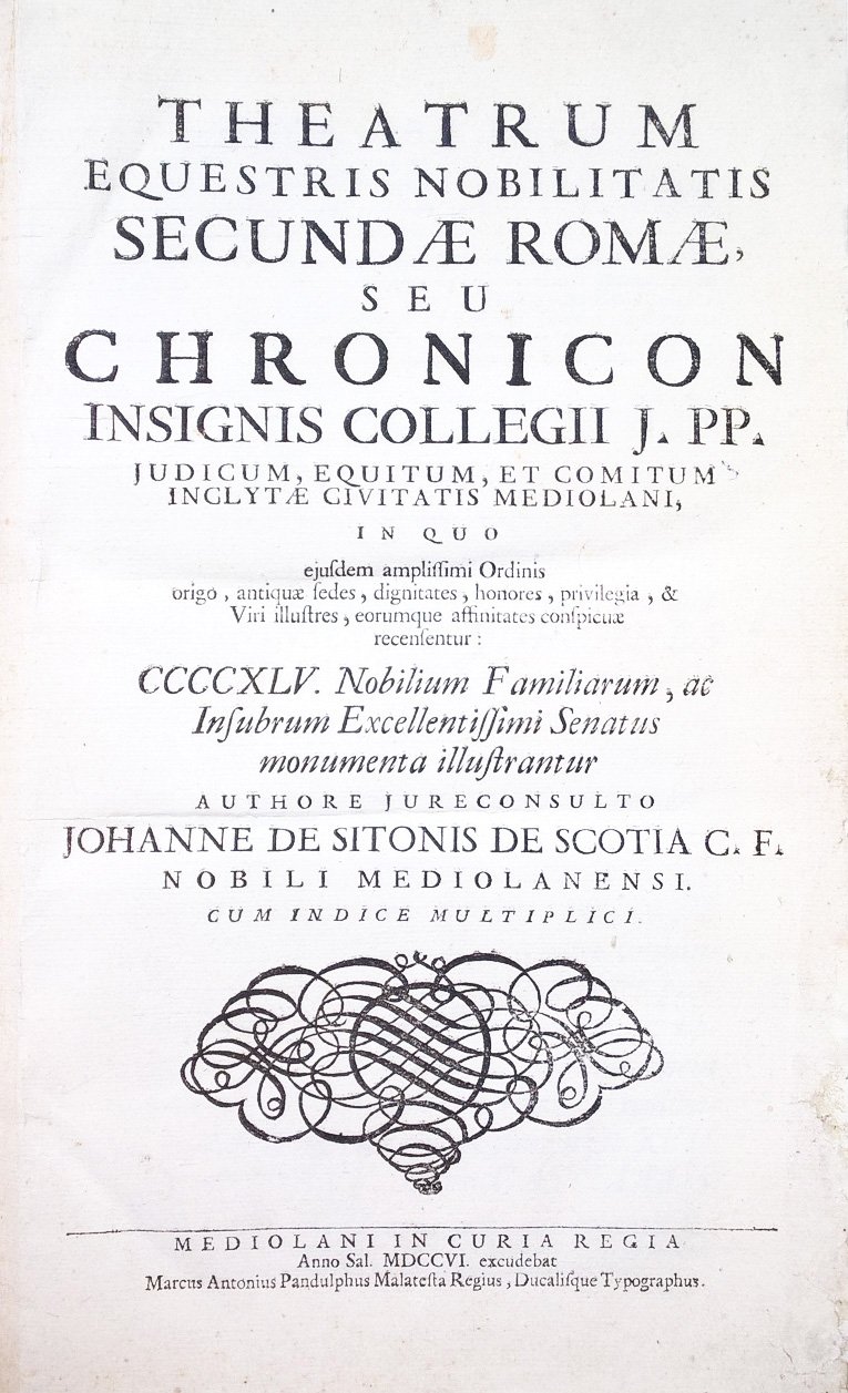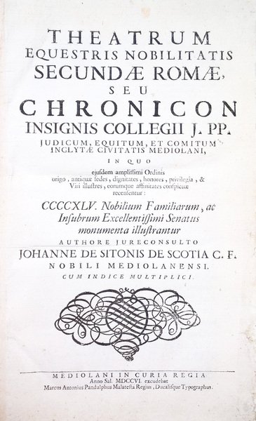 Theatrum equestris nobilitatis secundae Romae, seu Chronicon insignis Collegii J. PP. judicum, equitum, et comitum inclytae civitatis Mediolani, . authore jureconsulto Johanne de Sitonis de Scotia . Cum indice multiplici.