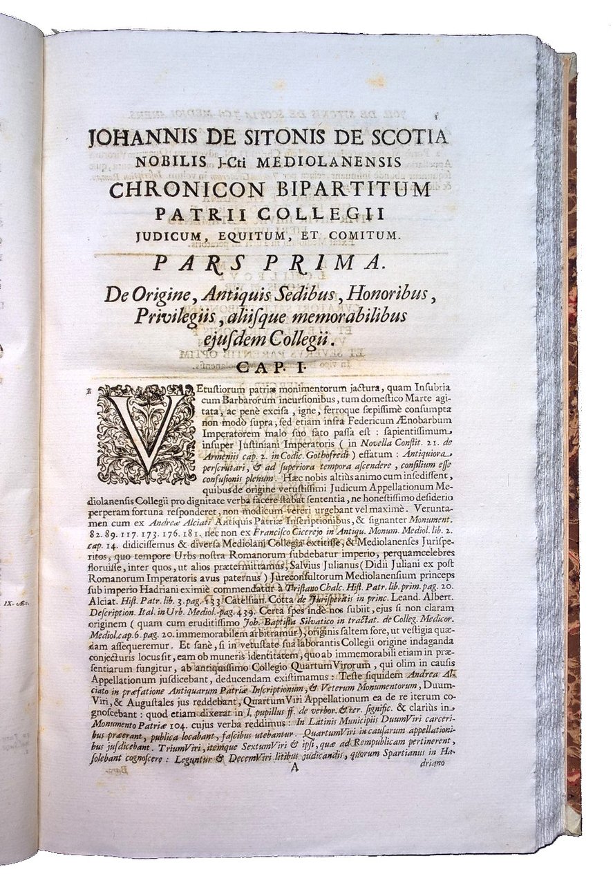 in-folio (360x226 mm), legatura posteriore in mezza pergamena con titolo manoscritto al dorso, piatti in carta marmorizzata a mano; pp. [4], [28], 292. Fregio xil. sul front; iniziali e fregi xilografici. Rara prima edizione di questo trattato genealogico sulle famiglie nobili lombarde, e milanesi in particolare, che raccoglie un'enorme mole di notizie relative a più di 2400 famiglie con relativi alberi genealogici. Di particolare interesse (alla fine del vol.) l'indice per famiglie dei giudici milanesi, seguito dal Catalogo cronologico delle principali cariche alle quali assursero alcuni giudici del Collegio milanese, nonchè gli elenchi degli auditori, degli avvocati, dei questori, dei senatori, dei cancellieri, degli avvocati fiscali, dei prefetti, dei professori del Collegio, ecc. Cfr. Predari, p. 189 - Cat. Hoepli,918. L'opera, una delle più antiche, documentate ed autorevoli opere a stampa riguardo alla nobiltà milanese, è stata compilata da Giovanni Sitoni di Scozia (1674-1762), giureconsulto italiano, membro della celebre famiglia nobile scozzese, illustre genealogista, tenuto in grandissima stima dai dotti del suo tempo. Rif.: IT\ICCU\RMLE\004571 (10 copie). OCLC, 82778080. Cond.: Margini laterali del frontespizio rinforzati. Rare fioriture. Carte pulitissime, in barbe, con rare fioriture. Presenza di alcune annotazioni a matita a margine del testo. Opera nel complesso quasi in ottime condizioni. -- Rare first edition of this genealogical treatise on noble families in Lombardy, and Milan in particular, compiled by Giovanni Sitoni of Scotland (1674-1762), Italian jurisconsult, member of the famous Scottish noble family. Quite fine copy.