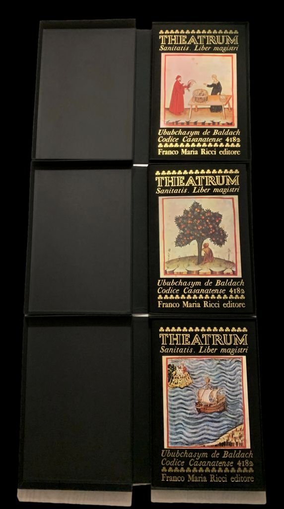 IN 4° grande (cm. 35x23); 3 tomi: 201, 149, 160, con 208 bellissime tavole a colori applicate a collage n.t. Legatura edititoriale in seta nera, con titolo in grande e trifogli impressi in oro al dorso e ai piatti dove sono presenti anche delle tavole applicate (il dorso del terzo volume si presenta leggermente arrossato come in tutti gli esemplari di quest'opera dato che la partita di seta che fu usata per il terzo volume di quest'opera si rivelò particolarmente sensibile alla luce). Cofanetti editoriali neri. Lussuosa edizione in carta vergata azzurrina di Fabriano su cui sono applicate le riproduzioni delle miniature del manoscritto. Testi critici di Adalberto Pazzini, Emma Pirani, Mario Salmi, Antonio Marazzi. Prima edizione stampata da Ricci che ne fece poi una seconda in 5000 esemplari nel 1971. Questo esemplare è nella prima edizione in "Tiratura speciale di 2500 copie riservata ai bibliofili amici di F.M.R.", in nostro esemplare è il n° 1064. OTTIMO ESEMPLARE, all'interno come nuovo.