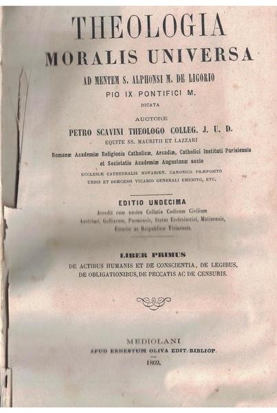 Theologia moralis universa ad mentem s. alphonsi m. de Ligorio Pio IX Pontifici M. Libro Primo. Mediolani editore.