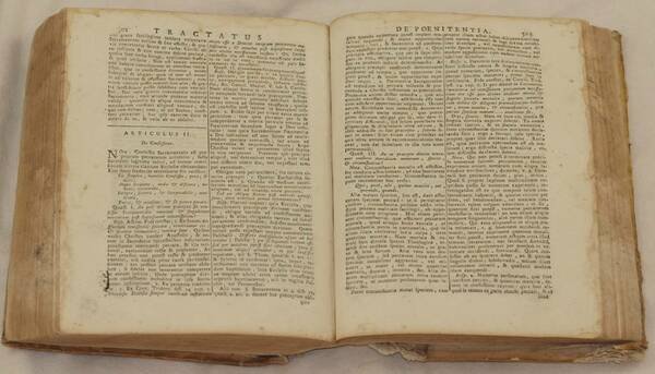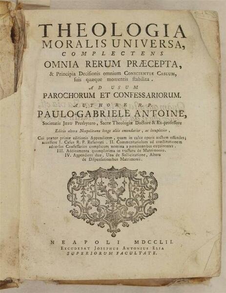 In 8. Dim. 24,5x18,5 cm. Pp. 700. Edizione del 1752 di questa celebre e fortunata opera teologica del gesuita e teologo francese Paule Gabriel Antoine (1679-1743). Pubblicata per la prima volta nel 1726, la sua "Theologia moralis" fu cosi apprezzata che Benedetto XIV decise di utilizzarla come testo per gli studenti del Collegio della Propaganda. A partire dal 1747 nella sua teologia vennero inserite anche proposizioni condannate, casi riservati e decreti di Benedetto XIV. Secondo l'opinione di Gury e Liguori Antoine mostrava un atteggiamento troppo severo. All'interno numerosi trattati: Coscienza, Leggi, Peccati, Virtù teologiche, Virtù religiose, Benefici ecclesiastici, Obbligazioni su certi stati e offici, Giustizia, diritto e restituzione, Contratti, Sacramenti, Censura e irregolarità (scomunica, sospensione) ecc. Opera completa di tutte le pagine. Copertina in piena pergamena coeva con titolo manoscritto al dorso. In buone condizioni.Copertina in piena pergamena coeva con titolo manoscritto al dorso in mediocri condizioni generali con usure e parti mancanti ai margini, piatti e dorso. Presenza di colla al dorso e piatti. Legatura in buone condizioni. All'interno le pagine si presentano in buone condizioni con fioriture e piegature agli angoli. Gore d'umidità marginali. Prima pagina di sguardia tagliata a metà. Edition of 1752 of this famous and lucky theological work written by the french theologist and jesuit Paule Gabriel Antoine (1679-1743). Published for the first time in 1726, his "Theologia moralis" was so appreciated that Benedetto XIV decided to use it as text for the students of College of Propaganda. From 1747 in his theology were put also condamned propositions, reserved cases and propositions of Benedetto XIV. According to the opinion of Gury and Liguori Antoine showed an excessively severe behaviour. Different treaties inside: Conscience, Laws, Pities, Theological virtues, Religious virtues, Church benefits, Obbligations on some states and offices, Justice, Right and restitutions, Contracts, Sacraments, Irregularities (scommunication, suspension) etc. Work complete of all pages. Full parchment coeval cover with manuscripted title in the spine. In good conditions. Full parchment coeval cover with manuscripted title in the spine in poor general conditions with wearings and missing parts in the edges, plates and spine. Some glue in spine and plates. Binding in good conditions. Inside pages are in good conditions with foxings and foldings in corners. Humidity stains in the edges. First endpage half cut.