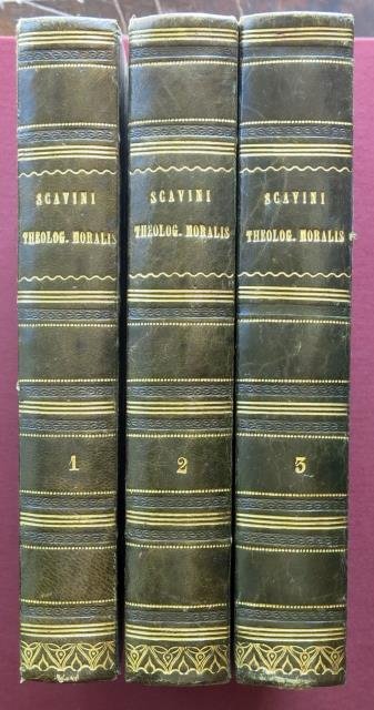 Ernesto Oliva, Milano, 1858. Tre volumi in 8vo, pp. 662; 730; 756. In antip. al primo volume incisione di Santamaria (presso E. Oliva, Milano) di S. Alfonso M. De Liguori, testo in latino (comprese le indicazioni editoriali al front.), testo anche in italiano al primo volume, schemi disegnati alla fine del terzo volume, leg. orig. con piatti in cartonato marmorizz. e dorsi in bella pelle verde con titoli oro. Si suppone opera completa in tre volumi, come riportato in altre catalogazioni. Conservazione molto buona di tutti i volumi.