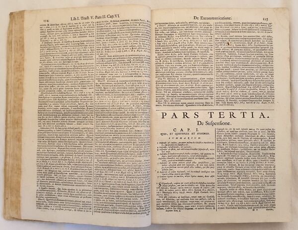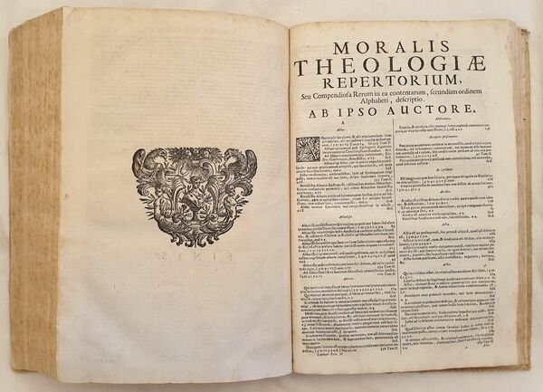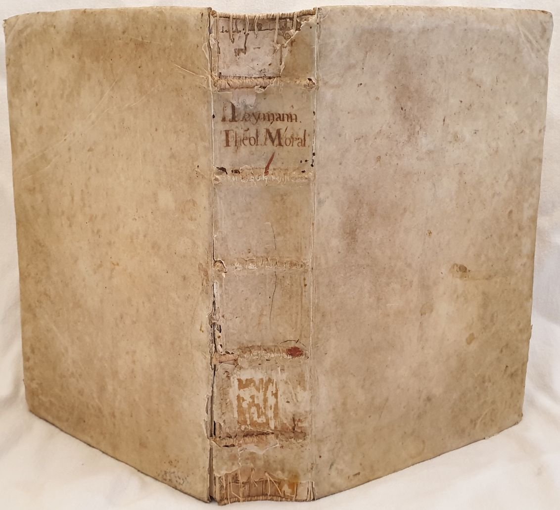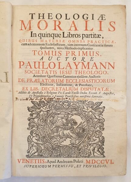 Bella edizione del 1706 della teologia morale di Paul Laymann (1574 - 1635) gesuita e professore di teologia morale a Monaco, importante canonico e moralista. Laymann fu prolifico scrittore di materie filosofiche, morali e giuridiche. La sua teologia morale conobbe moltissime edizioni. L'opera è formata da due tomi legati insieme in un volume ed è completa. Alla fine del volume "Quaestiones canonicae de Praelatorum Ecclesiasticorum electione" e "De apostasia religione Quaestio Fr. Caroli Tirelli" entrambi con il proprio frontespizio. Tra gli argomenti trattati: adulterio, crimini, malefici, dispense ecclesiasticeh, divorzio, duello, esorcismi, scomuniche, feudi, fideiussori, omicidi, eredità, impedimenti, pellegrini, sacrilegio, ecc. Bella incisione dell'albero genealogico. Antica nota di possesso datata 1730 al frontespizio. In buone condizioni e completo. Copertina in piena pergamena coeva con titolo manoscritto al dorso in buone condizioni generali con usure e parti mancanti ai margini e dorso. Legatura in buone condizioni. All'interno le pagine si presentano in buone condizioni con fioriture. Lieve gore marginali. In 4. cm 33x23. Pp. (8)+412+387+(1)+(88)+40+16. Beautiful edition of 1706 of moral theology by Paul Laymann (1574 - 1635) jesuit and teacher of moral theology in Monaco, important canonic and moralist. Laymann was prolific writer of phylosophycal, moral and juridical matters. His Moral theology was published different times. the work oiis made up of two tomes bound together in a unique volume and it is complete. At the end of the volume "Quaestiones canonicae de Praelatorum Ecclesiasticorum electione" and "De apostasia religione Quaestio Fr. Caroli Tirelli" both with its own title page. Between the issues treated: crimes, spells, divorce, duel, exorcisms, murders, heredity, pilgrimages, etc. Beautiful engraving of genealogical tree. Antique signature dated 1730 in the title page. In good conditions and complete Full parchment coeval cover with handwritten title in good general conditions with wearings and missing parts in the edges and spine. Binding in good conditions. Inside pages are in good conditions with foxings. Slight water stains in the edges. In 4. cm 33x23. Pp. (8)+412+387+(1)+(88)+40+16