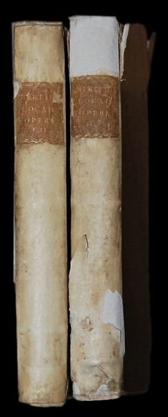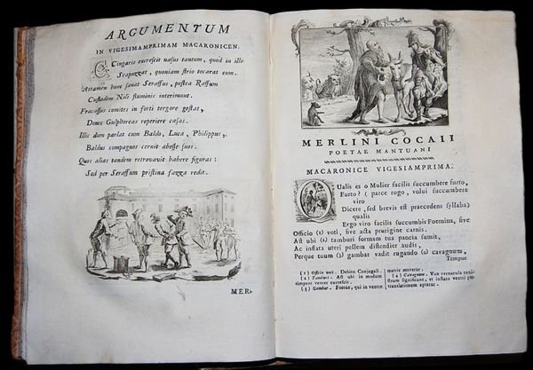 In 4° grande (27x19,5 cm); 2 tomi: I° vol. (4 con ritratto in antiporta di Folengo delineato da Conti ed inciso da Cagnoni), 8, (1), 307, (19) pp. e una tavola genealogica dellautore ripiegata nellultima pagina della vita di Folengo; II° (6), 411, (1) pp. Bella legatura coeva in mezza pergamena con titolo in oro su fascette marroni al dorso (il dorso del I° volume presenta un piccolo restauro con aggiunta di pergamena al margine superiore e uno strappetto senza perdita di materiale in corrispondenza di una delle cerniere). Piatti foderati con bella carta coeva a motivi geometrici (qualche strofinatura e lievi segni del tempo), all'interno in ottime condizioni di conservazione. Primo frontespizio in rosso e nero. Tagli leggermente spruzzati in azzurro e rosso. L'opera è arricchita da belle e grandi illustrazioni di gusto veneziano nei capilettera, testatine e finalini (35 nel primo volume; 40 nel secondo). Errore num. p. 124 per 224, p. 208 per 308, p. 233 per 333. Bellissima edizione illustrata considerata la più completa e corretta delle opere di Gerolamo Folengo più conosciuto come Teofilo Folengo (o con gli pseudonimi Merlin Coccajo o Limerno Pitocco), (Mantova, 8 novembre 1491 Campese, 9 dicembre 1544) celebre poeta italiano, tra i principali esponenti della poesia maccheronica. Nei volumi oltre allOpus Macaronicum, la Zanitonella, la Moscheide e gli Epigrammi; in fondo aggiunto anche un vocabolario mantovano-toscano-latino. Edizione stampata da Braglia a Mantova anche se con falso luogo di stampa (Parenti, Falsi luoghi, p. 19). Buon esemplare dalla carta sonante. Rif. Bibl.: Brunet, I, p. 557.